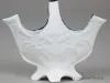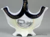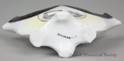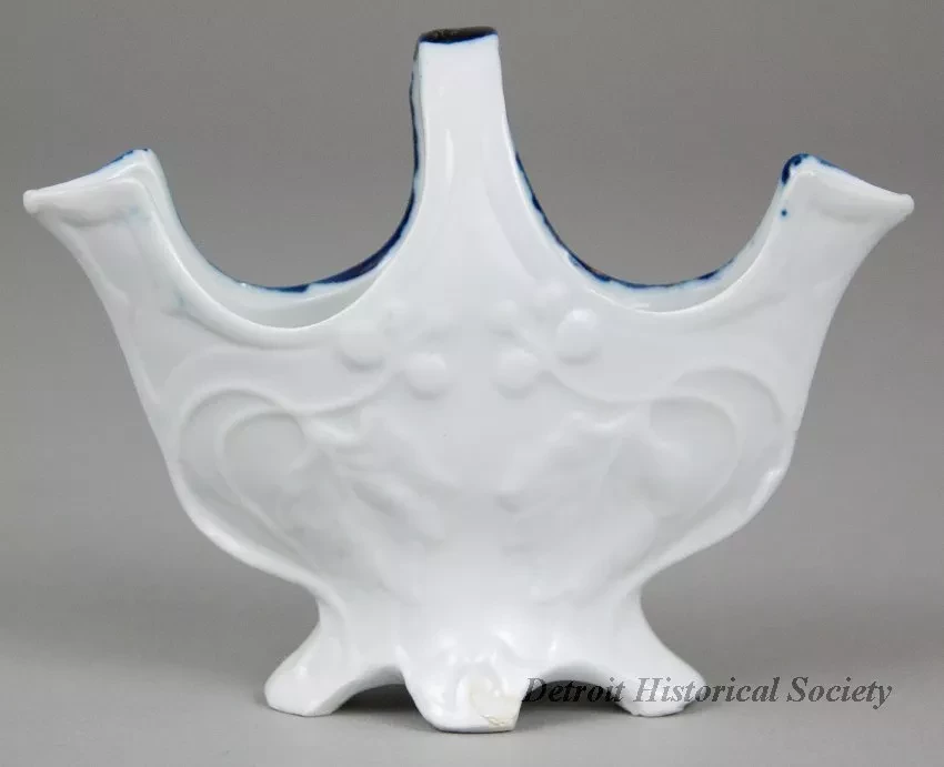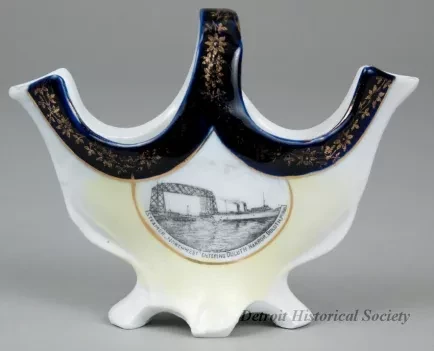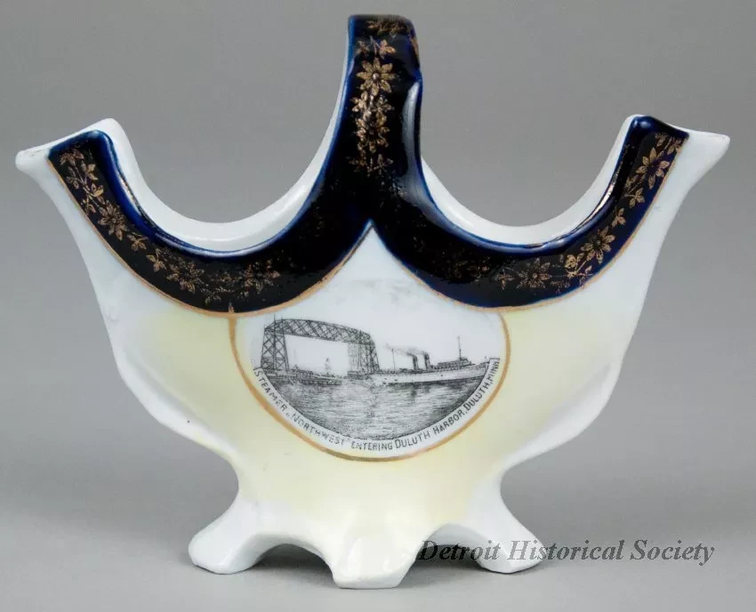 One souvenir vase from the passenger steamship, SS North West, of the Northern Steamship Company. The small vase is made of white glazed china that has been painted cobalt blue and pale yellow on one of the exterior sides. It has a flat, basket-shaped body with decorative curved top edges, a center handle, and a decorative base with four small feet. A circular black and white image of the steamship and a bridge is printed at the center of the painted side of the vase. Black printed text beneath the image reads "Steamer North West Entering Duluth Harbor, Duluth, Minn." Narrow gold-colored stripes and floral patterns provide additional decoration on the painted side. The unpainted side has a raised leaf/berry design. The number, "6508," is stamped on the underside of the base, but no manufacturer's name is shown.