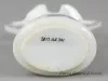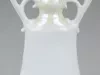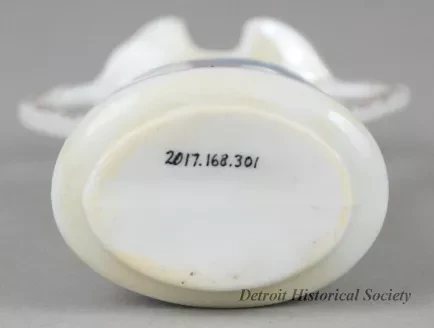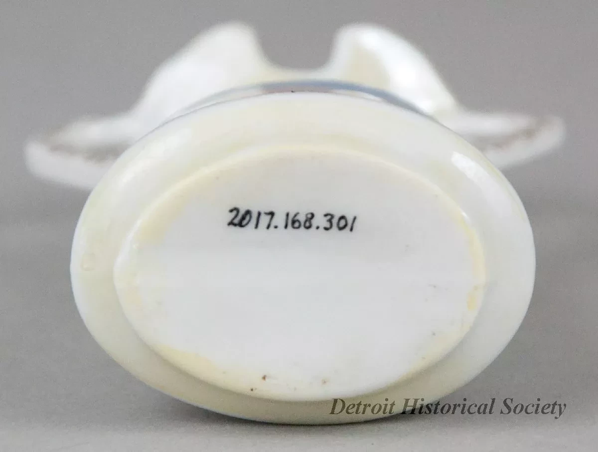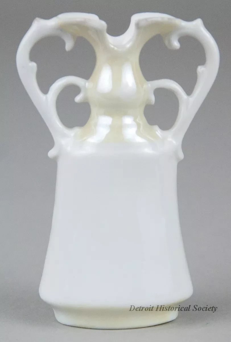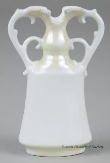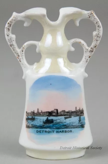 One souvenir vase from Detroit. The small vase is made of white glazed china that has a pale green iridescent color on the top and at the base. It has a narrow decorative neck with scrollwork handles on opposite sides, an oval-shaped body (as viewed from the top) that flares outward slightly toward the base, and an inward curve at the lower edge that forms a small oval-shaped base. A circular multi-color image of the Detroit waterfront is printed at the center of one side of the vase. Black printed text beneath the image reads "Detroit Harbor." Gold-colored paint on the handles creates a slight sparkle effect. No manufacturer's name or marks are shown.
