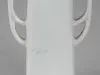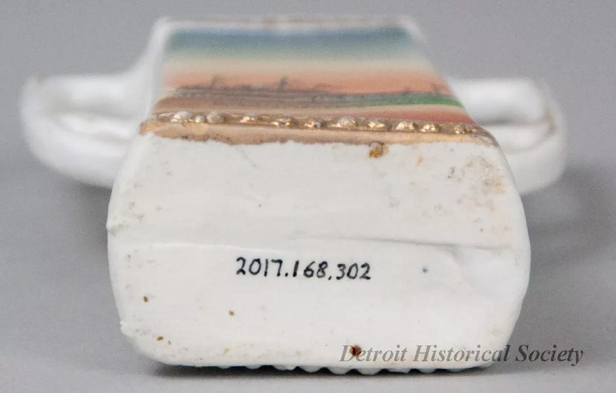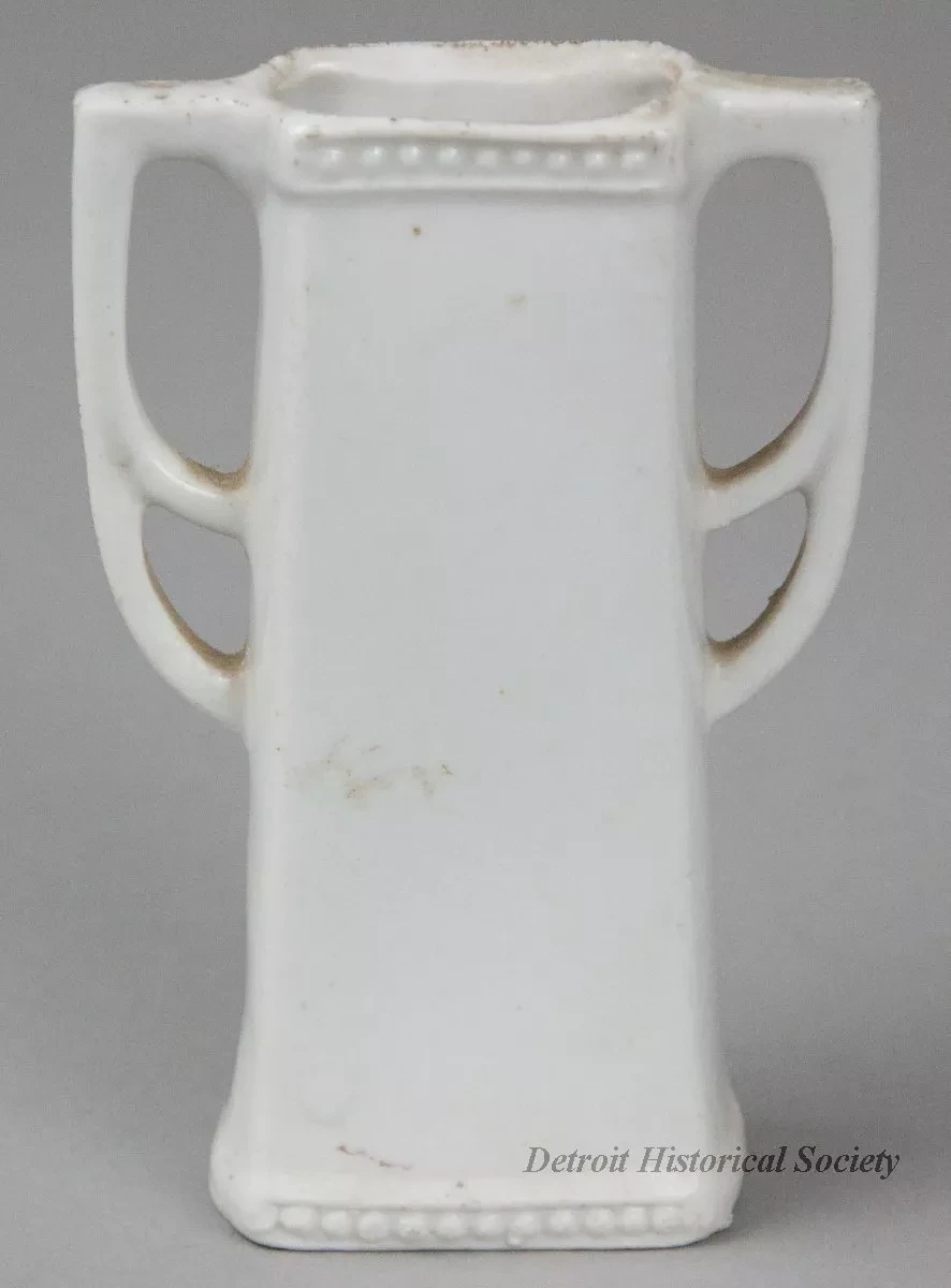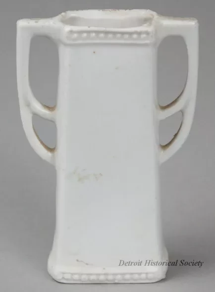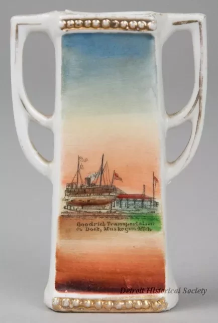 One souvenir vase from Muskegon, Michigan. The small vase is made of white glazed china. It has a narrow open top and a rectangular body with straight sides that flare outward slightly to form a wider base. It has a beaded pattern at the top rim and base, decorative handles on opposite sides, and narrow gold-colored painted stripes on the rim, base, and handles. A multi-color image of a waterfront scene in Muskegon covers one side of the vase. Black printed text beneath the image reads "Goodrich Transportation Co. Dock, Muskegon, Mich." No manufacturer's name or marks are shown.