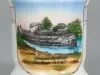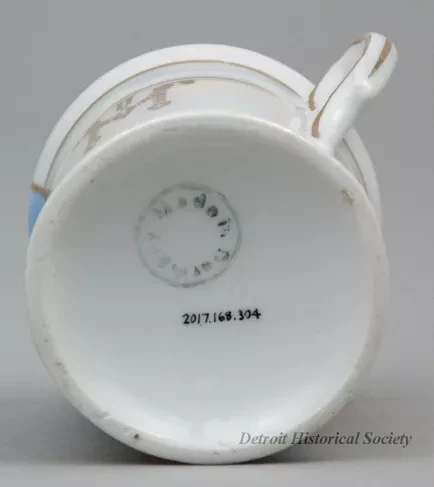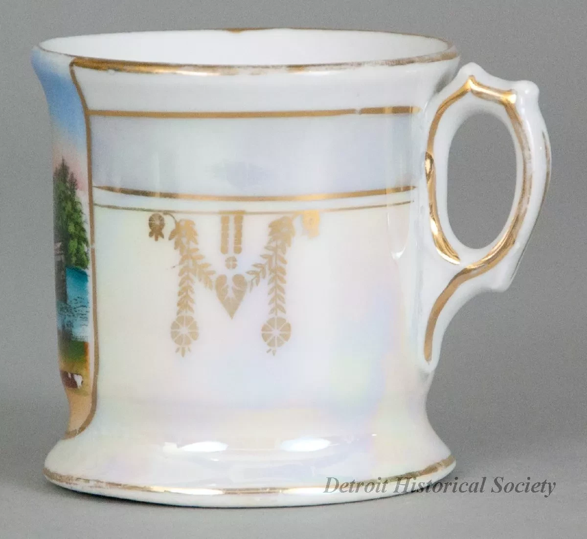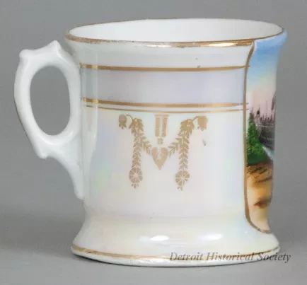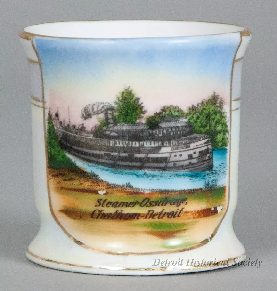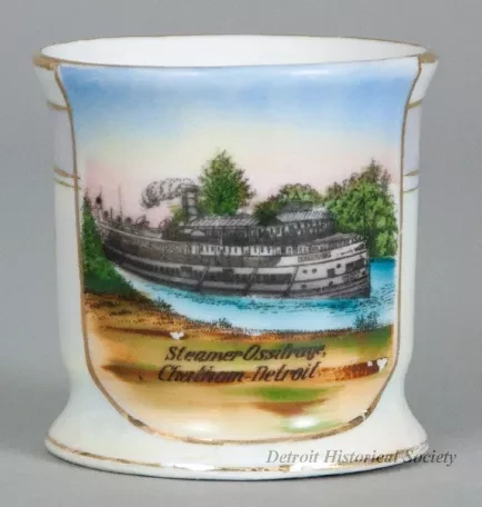 One souvenir miniature mug from the passenger steamship, SS OSSIFRAGE, of the Chatham Navigation Company. The mug is made of white glazed china. It is cylindrical in shape with vertical sides, a top edge and base that are flared outward slightly, and a decorative rounded handle on the side. Narrow gold-colored stripes are painted along the top edge, base, and handle. A narrow light iridescent blue horizontal band with gold-colored edge stripes is located beneath the top edge of the mug. Decorative gold-colored leaf/floral designs are painted beneath the band on opposite sides. At a break in the band on the side of the mug opposite the handle, a multi-color image is printed which depicts the steamship underway on the Thames River. Black text beneath the image reads "Steamer Ossifrage, Chatham-Detroit." The number "278," is stamped on the underside of the mug along with black text that reads "Made in Germany."