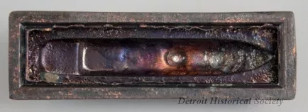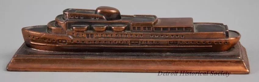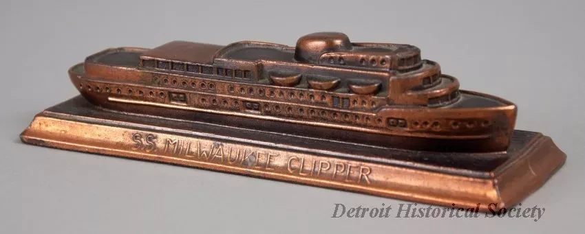 One souvenir sculpture from the SS MILWAUKEE CLIPPER of the Michigan & Wisconsin Steamship Company. The souvenir is made of cast brass and shows a sculpture of the ship on a flat, rectangular base. Raised text along the front edge of the base reads "S.S. Milwaukee Clipper." The exterior surface has an antique gold/brown finish and the hollow interior is unfinished. No manufacturer's name or marks are shown.