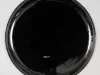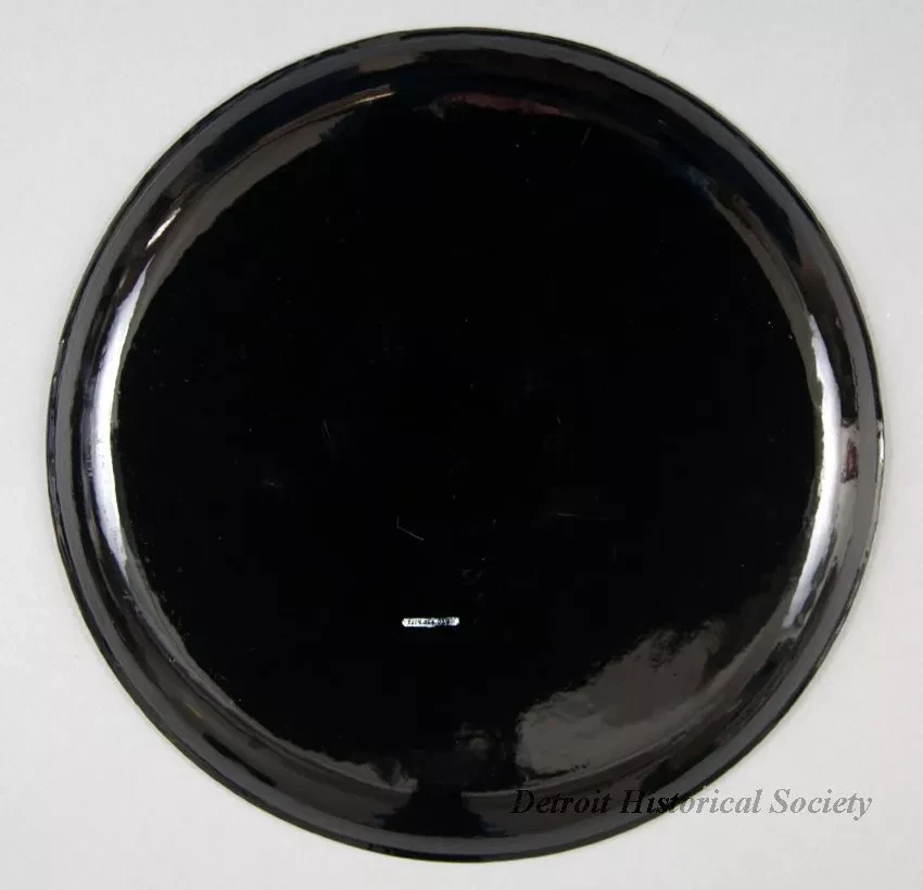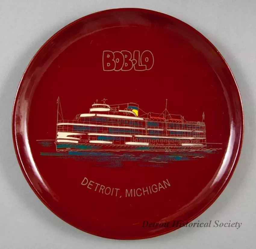 One souvenir plate or serving tray from Bob-Lo Island and the excursion steamship, SS STE. CLAIRE. The round plate is made of thick plastic. It has a curved rim with a rounded top edge. The top surface of the plate is painted dark red and has a blue/white/silver image at the center that depicts a port side view of the SS STE. CLAIRE underway. Silver-colored text at the top reads "Bob-Lo" with "Detroit, Michigan," at the bottom. Small silver-colored text on the side of the steamship reads "Bob-Lo Company - a Browning Line." The plate underside is painted black. No manufacturer's name or marks are shown.