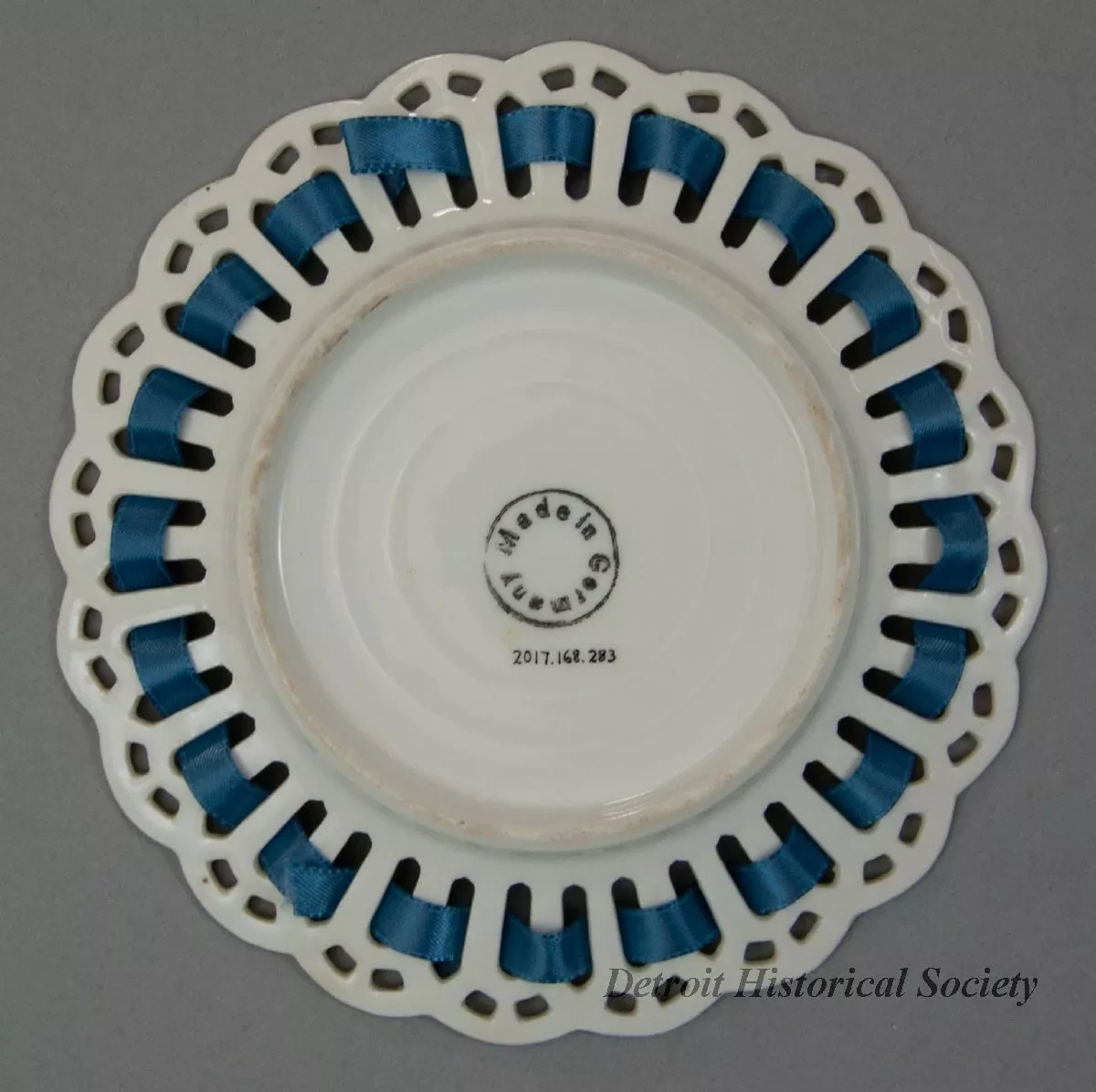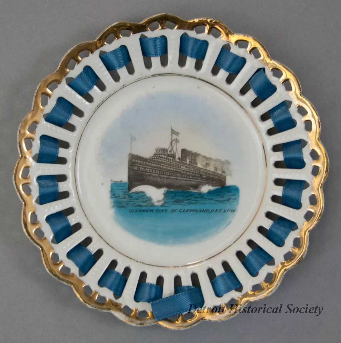 One small souvenir plate from the passenger steamship, SS City of Cleveland, of the Detroit and Cleveland Navigation Company (D&C Line). The dish is made of thin white glazed china. It has a flat, upturned rim that has a filigree cutout design and a scalloped edge. A blue satin ribbon is interwoven through the cutouts on the rim. The scalloped edge is painted gold and a narrow gold stripe encircles the plate along the inner edge of the rim. A multi-color drawing at the center of the plate shows a port side bow view of the steamship underway in fair weather. Black text beneath the image reads "Steamer City of Cleveland, D&C Line." Black printed text on the plate underside reads "Made in Germany."