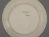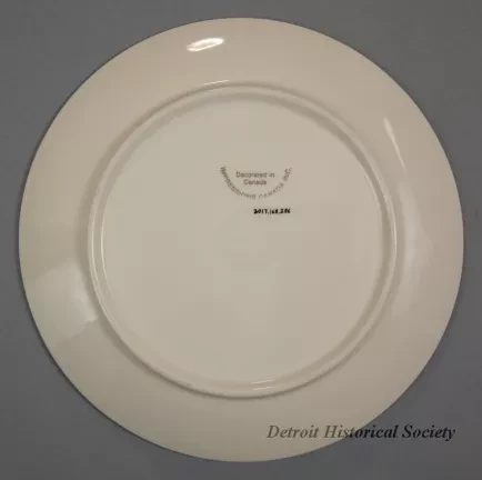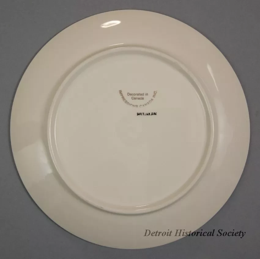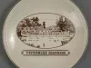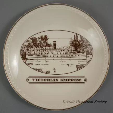 One souvenir plate from the MV Victorian Empress of the St. Lawrence Cruise Lines. The round plate is made of glazed china in a bone/ivory color. It has curved sides, a gently-curved bottom, a decorative beaded line near the outer edge and a narrow gold-colored stripe along the outer edge. An oval-shaped, sepia-toned image of the starboard side of the ship is printed at the center of the plate along with sepia-toned text that reads "Victorian Empress." The plate underside is stamped with gold-colored text that reads "Decorated in Canada, Impressions Canada, Inc."