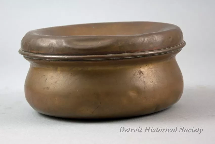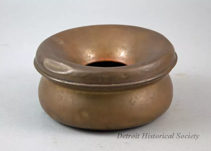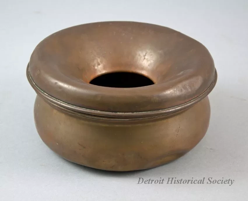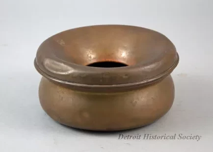One spittoon from the Penobscot Building in Detroit. The spittoon is made of brass and has a wide, bowl-shaped bottom with a removable, friction-fit lid. The lid has a rolled outer edge and the top surface is sloped downward to a 3.25-inch diameter opening at the center. No manufacturer's marks are visible.