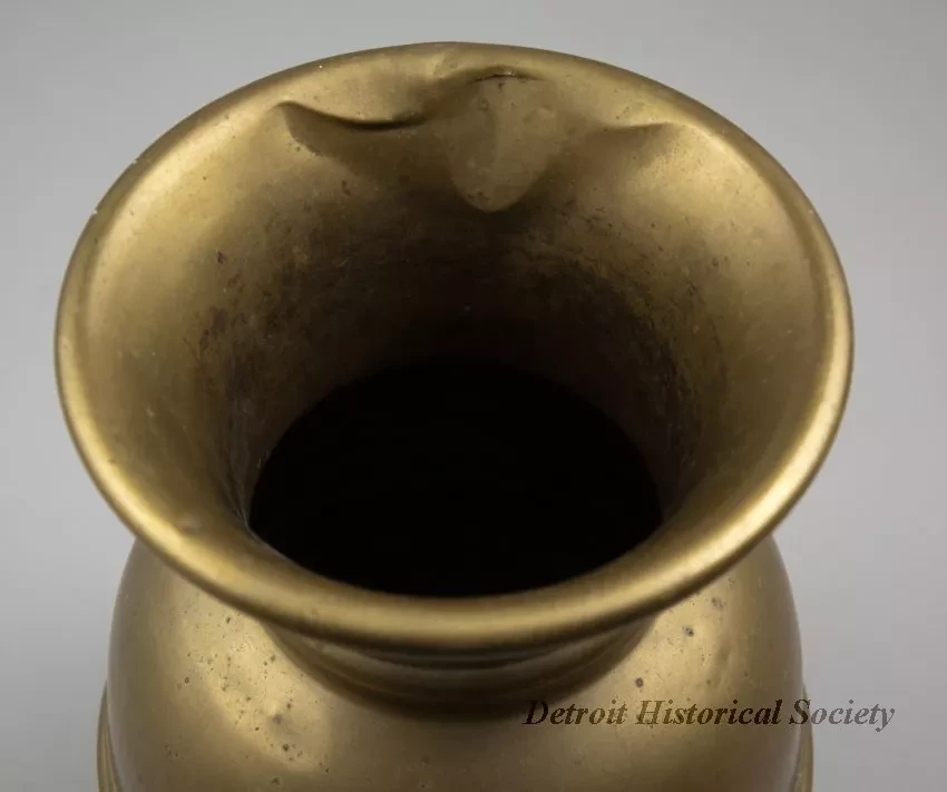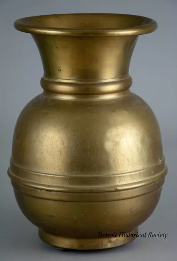 One spittoon from a downtown Detroit building or business. The tall, urn-shaped spittoon is made of brass. It has a weighted bottom with three short flat feet that have been welded to the underside. No manufacturer's name or marks are visible.