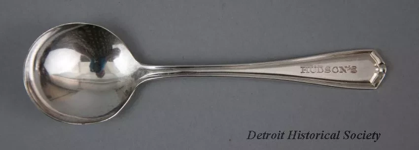 One bouillon spoon from the 13th floor restaurant at Hudson's downtown Detroit store. The spoon is made of a copper/nickel alloy in a traditional Chippendale-style design with a short handle, round bowl, and a polished silverplate finish. The top of the handle has stamped text that shows "Hudson's." The underside has stamped text that shows "Oneida Hotel Plate."