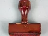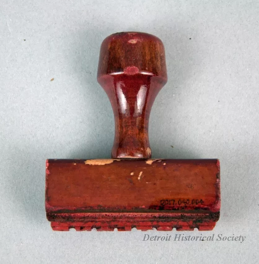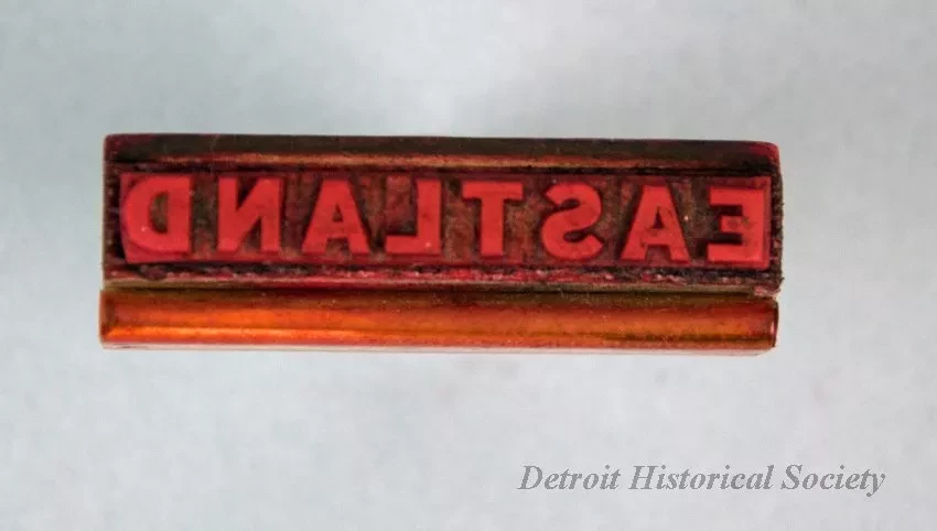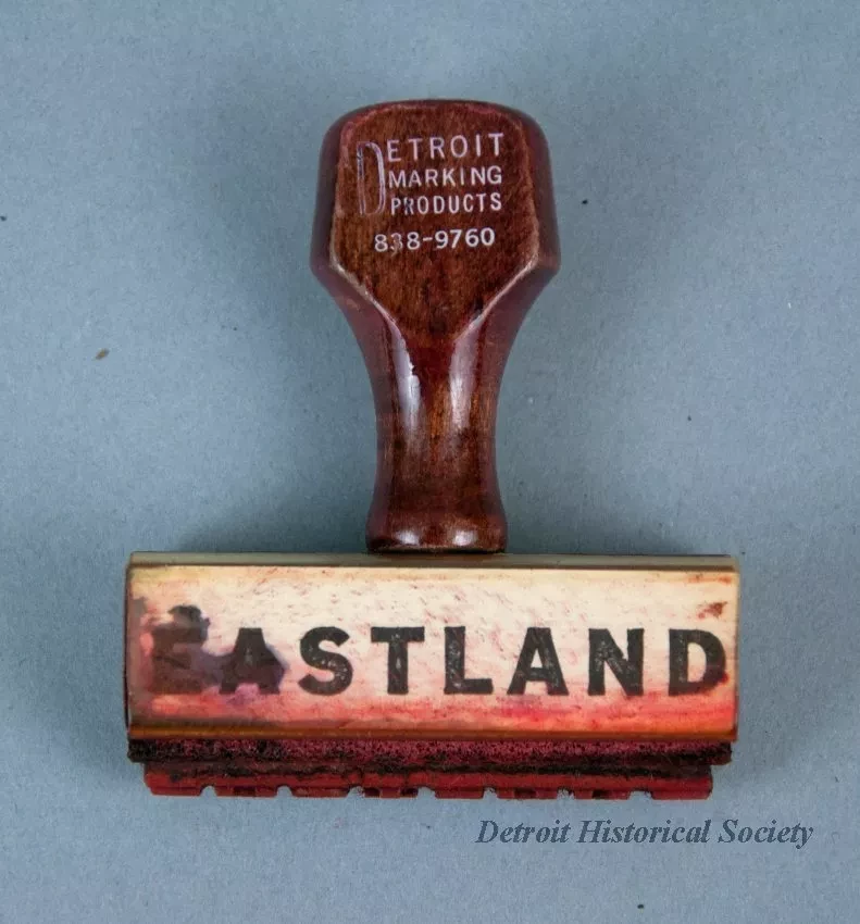 One ink stamp from Hudson's Eastland store. The stamp has a wood handle and rectangular wood base that have been finished with a brown stain and a coat of glossy varnish or lacquer. Red rubber letters on the bottom of the base that show the name, "EASTLAND." White lettering on the side of the handle shows "Detroit Marking Products, 838-9760."
