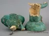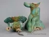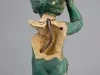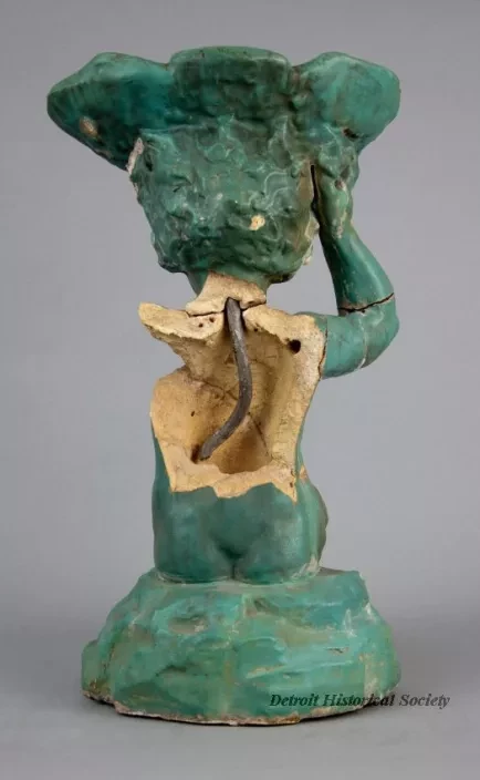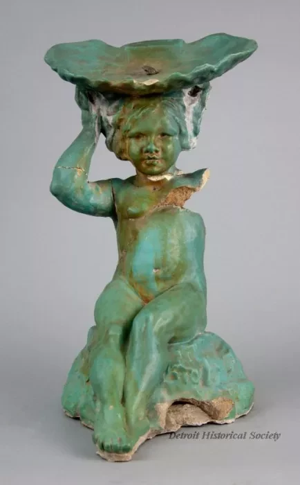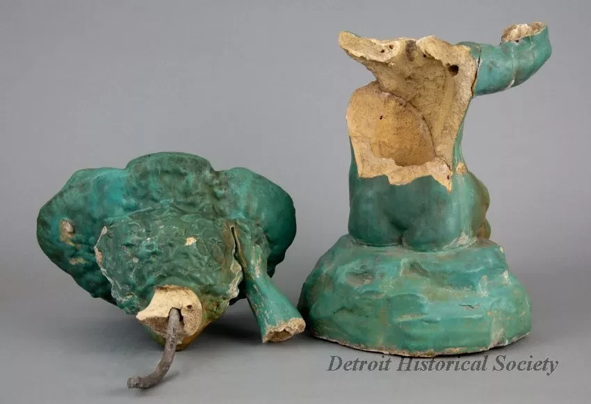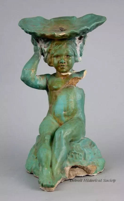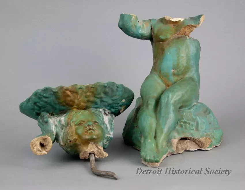One small statue (broken) of a young female figure which was salvaged from the center of a fountain that was located in the Graystone Ballroom, Detroit. The hollow statue was cast in non-reinforced concrete and depicts a young nude woman who is seated on rock and is holding a large oyster half shell on top of her head. The exterior surfaces have a smooth finish and have been painted in a turquoise color. It appears that a coating of semi-gloss clear acrylic or similar sealer has been applied over the paint. The hollow interior is rough and unpainted. A 0.5-inch diameter lead pipe (broken) is located inside the statue and supplies water to the top of the oyster half shell which then falls over the edge of the shell onto the statue.