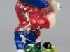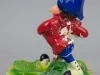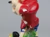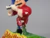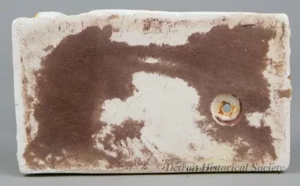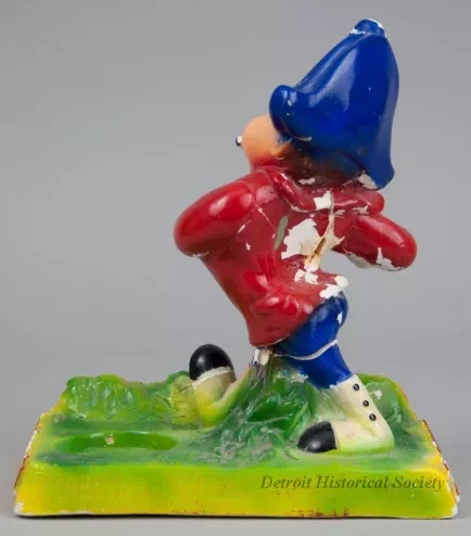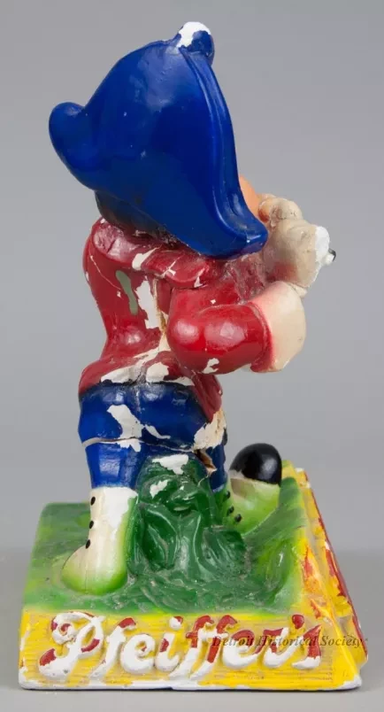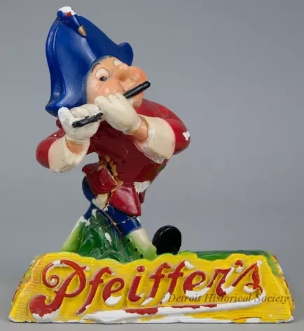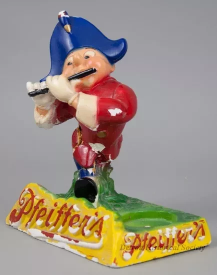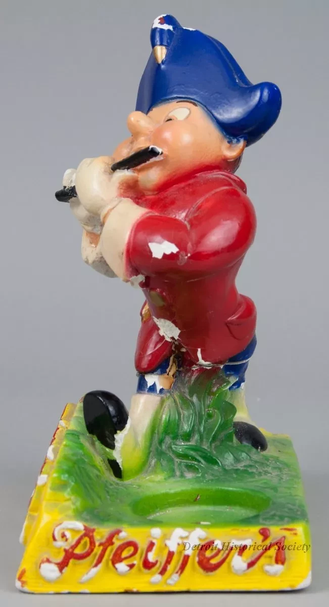 One small advertising statue of Pfeiffer Brewing Company mascot, "Johnny Pfeiffer." The multi-color painted plaster statue depicts a Revolutionary War "Minuteman" figure who is walking on a grassy field and is playing a fife. The name, "Pfeiffer's," is shown in raised red script text on three sides of the rectangular base. An inset circle near one corner of the base was intended to hold a Pfeiffer's beer bottle. Stamped text on the back edge of the base reads "Pfeiffer's Brewing Co., Detroit & Flint, Mich.," and "Made by Plasto Mfg., Chicago, Ill."