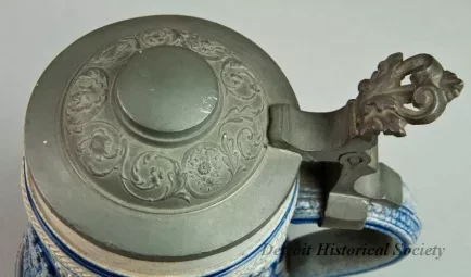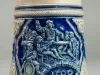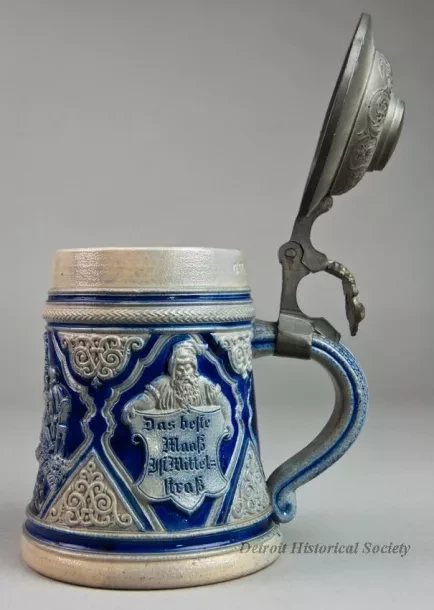 One beer stein made of light gray glazed ceramic pottery. The sides curve outward slightly to form a base that is wider than the top. The stein has a thin, rounded rim at the top, a decorative pewter hinged lid, and a curved handle at the side. The sides are covered with elaborate blue/gray relief scrollwork designs and a tavern scene with the year "1588." Two separate head and upper torso images of men are also shown and each is holding up a shield-shaped scroll with blue German fraktur text. One scroll has text that reads "Halt Maas u. Ziel, Trink nie zuviel [Maintain measure and moderation, never drink too much]," and the other reads "Das beste Maas ist Mittel-strass [The best measure is the middle of the road]." Stamped text near the top of the handle reads "0.5L [liter]." The underside is stamped with the number, "375." No manufacturer's name or marks are visible.