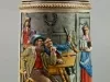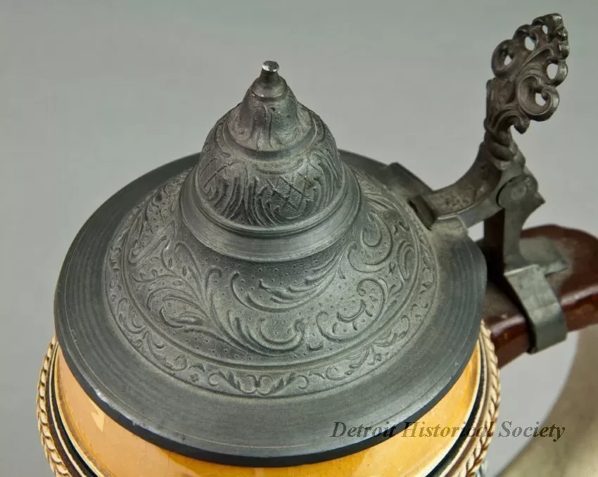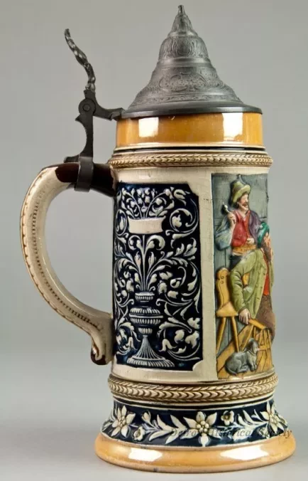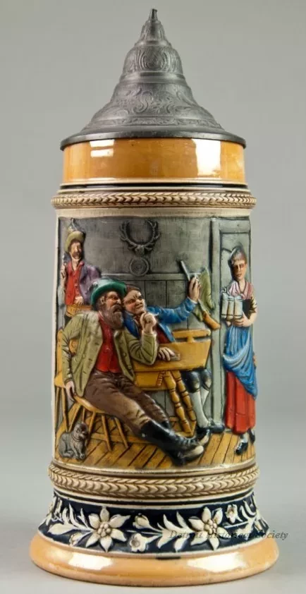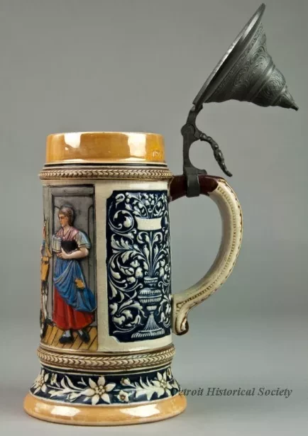 One beer stein made by the J. W. [Johann Wilhelm] Remy factory of Hohr, Germany. The stein is made of glazed ceramic pottery with straight sides that taper outward slightly to form a base that is wider than the top. The tall stein has a thin, rounded top rim, a decorative pewter hinged lid, and a rounded handle at the side. The side opposite the handle shows an elaborate colorful relief image that depicts a tavern scene. Adjacent matching relief images show urns with decorative leaf/floral designs. Decorative multi-color bands of scrollwork and floral designs are located below the top rim and above the base. Stamped text near the top of the handle reads "0.5L [liter]." The underside is stamped with the number, "524," and "Germany." The manufacturer's mark is not visible. The number, "524," is the catalog number for the stein design, "Tavern Scene."