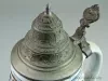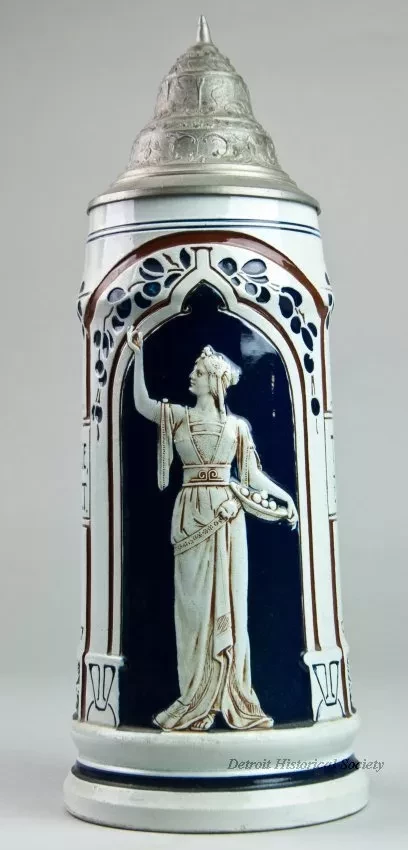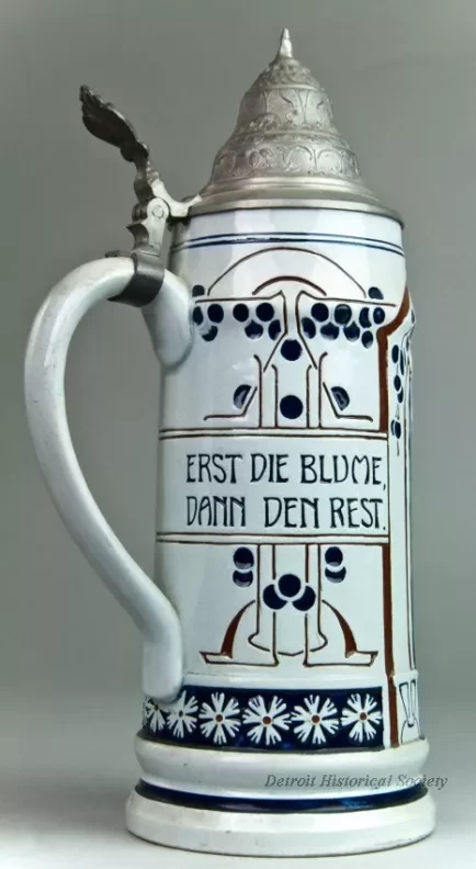 One beer stein made of light gray glazed ceramic pottery. The tall, straight sides are tapered to form a base that is slightly wider than the top. The stein has a thin, rounded rim at the top, a decorative pewter hinged lid, and a curved handle at the side. The sides are decorated with red/blue incised and raised designs and a Roman-style figure of a woman who is gathering fruit from an overhead vine-covered arbor. Blue incised text reads "Trinke Immer Brau u. Fest [Always drink uprightly and firmly]," and "Erst die Blume, Dann den Rest [First the flower, then the rest]." The underside is stamped with the number, "70." No manufacturer's name or marks are visible.