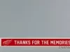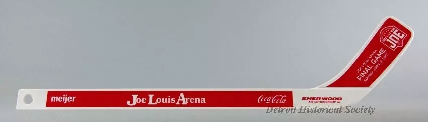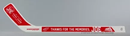 One miniature souvenir Detroit Red Wings hockey stick made of white plastic. It has red/white contrasting text on the handle that reads "Thanks for the Memories, Joe," and also shows the Red Wings logo. Additional text on the blade reads "Joe Louis Arena Final Game, Sunday, April 9, 2017." The stick was made in Canada by "Sher-Wood Athletics Group."