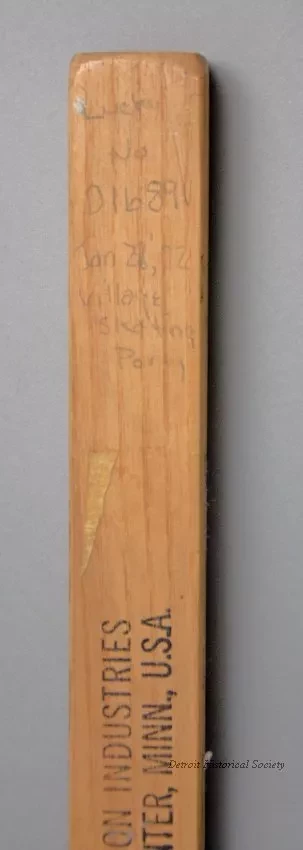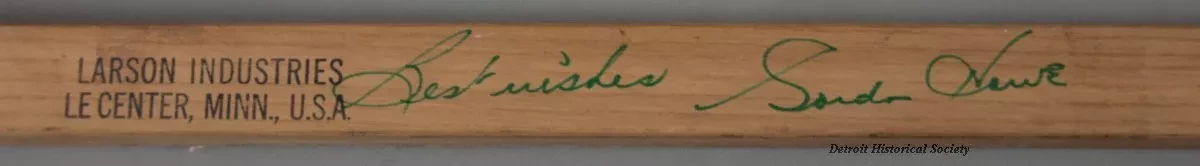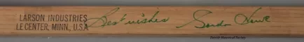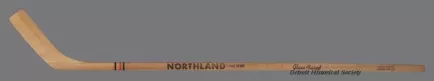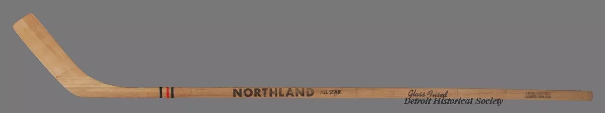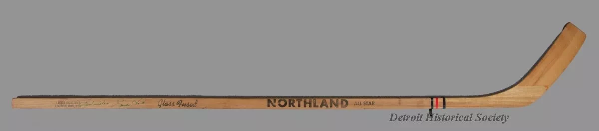 One "Glass Fused, Northland All Star" hockey stick made by "Larson Industries, Le Center, Minn., U.S.A." The right hand stick is made of wood and its curved wood blade is wrapped with clear fiberglass tape to minimize splitting along the wood grain. The upper part of the handle has been signed in black ink, "Best Wishes, Gordon Howe."