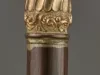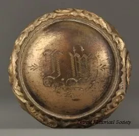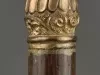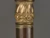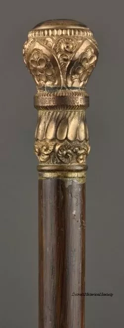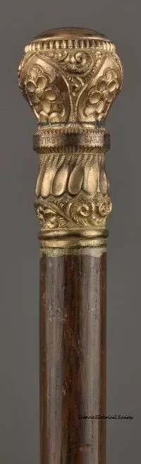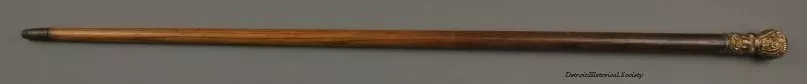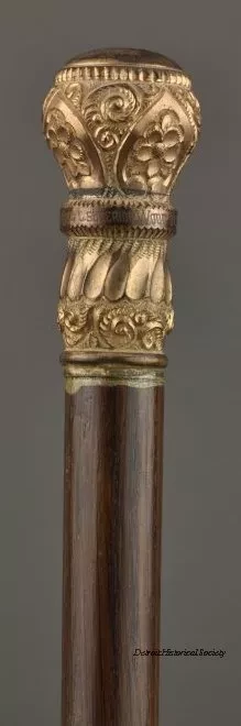 Walking Stick. A walking stick made from wood from the Independence, the first steamship on Lake Superior, which sank following a boiler explosion in 1845. The ornate knob-shaped metal handle includes a band inscribed with, "Wood of the Independence first boat sailed L. Superior" among its cast scrollwork. The initials "I. M." are engraved into the top of the handle in a blackletter typeface. "Gold roll plate" is also inscribed at the base of the handle suggesting it is made of brass laminated with gold. A metal cleat is attached to the foot of the stick.
