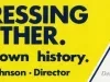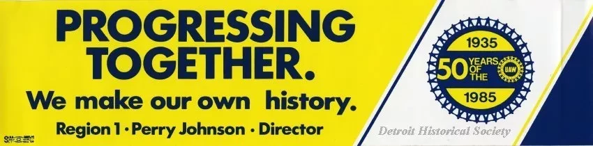 Bumper Sticker. Rectangular United Auto Workers bumper sticker printed with "Progressing Together. We make our own history. Region 1 - Perry Johnson - Director," in blue on yellow on the left; and a 50th anniversary logo for the UAW composed of the figures with interlocked hands from their standard logo encircling the words, "50 Years of the UAW," and the dates 1935 and 1985 in blue and yellow on white on the right.