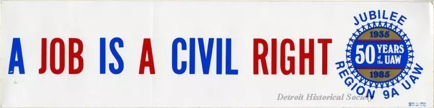 Bumper Sticker. Rectangular United Auto Workers bumper sticker printed with "A Job is a Civil Right" in white and red letters on a white background on the left, and a 50th anniversary logo for the UAW composed of the figures with interlocked hands from their standard logo encircling the words, "50 Years of the UAW," and the dates 1935 and 1985, surrounded with "Jubilee Region 9A UAW," in blue, with gold and red highlights on the right.