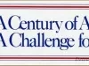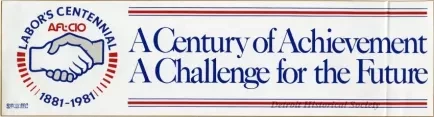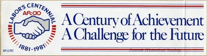 Bumper Sticker. Rectangular AFL-CIO bumper sticker printed with "A Century of Achievement, A Challenge for the Future," framed with horizontal stripes in blue and red on white on the right, and the AFL-CIO symbol depicting two hands shaking, surrounded with "Labor's Centennial, 1881-1981," in blue, red, and grey on the left.