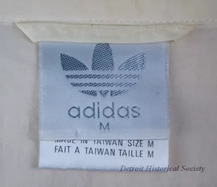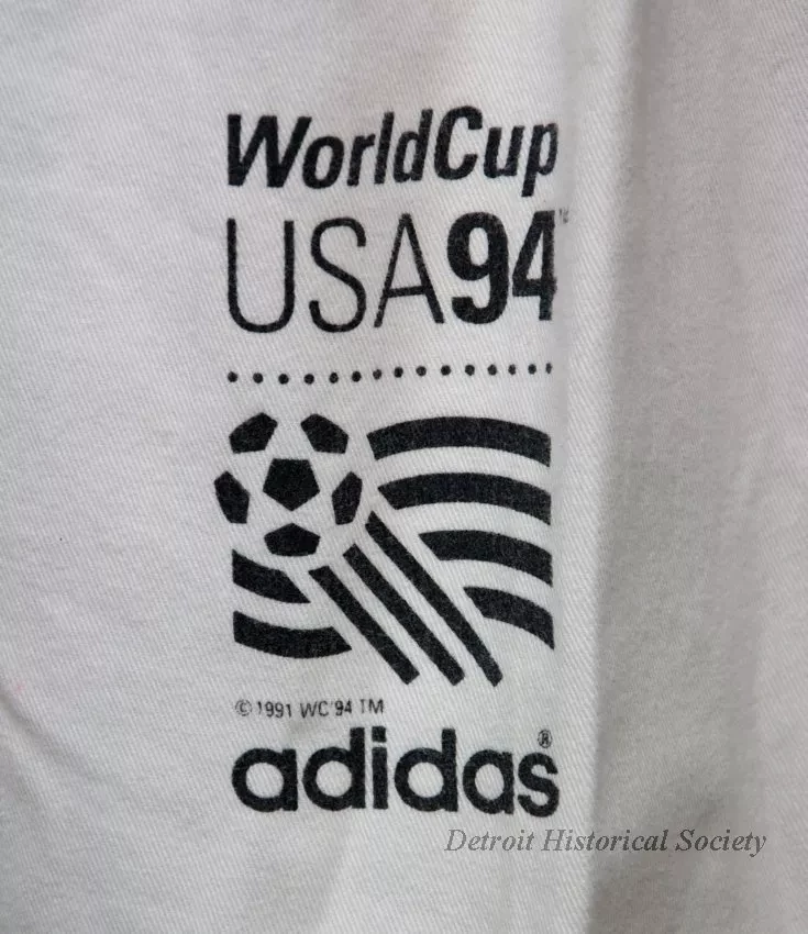 The lightweight jacket is made of white nylon fabric. It has a stand-up collar, wide shoulders and armholes, long sleeves with elastic cuffs, an elastic waistband, and a zipper down the center front. The left sleeve is red and the right sleeve is blue. The front and back of the body have a red/white/blue stripe design that includes a blue soccer ball. Red and black text over the left breast reads "WorldCup USA94" and "Addidas." Black text on the left shoulder back reads "Making Soccer History." Labels on the inside back of collar shows "Addidas, M," along with fabric content/manufacture details and fabric care instructions.