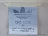 The long, loose-fitting pants are made of white cotton fabric. They have an elastic waistband with an internal drawstring, a button fly, side seam pockets, and a button pocket on the right back. Black printed text above the left knee reads "WorldCup USA94," and "Addidas." A multi-color label on the inside back waistband shows "Addidas" and trademark details. An adjacent label shows fabric content/manufacture details, fabric care instructions, and size "Large."