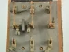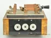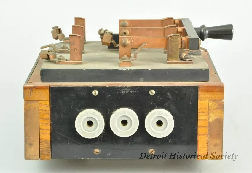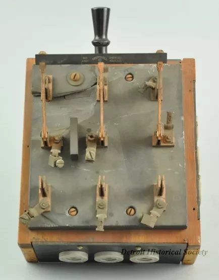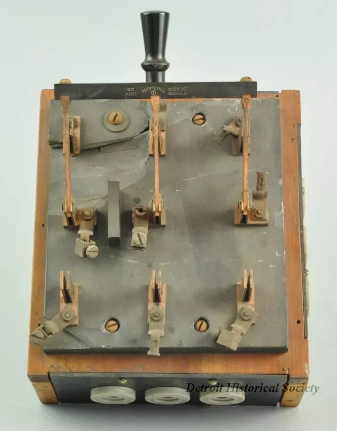 A 3-pole, double throw knife switch, mounted atop a wooden box with wire connectors on three sides. The switch components are made of copper and mounted on a 3/4" thick slate base. The handle is made of turned wood, painted black. A 6" wide bar made of slate connects the three blades. The bar is labelled 60 AMP TRUMBULL 250 V. D.C. 500 V. A.C.