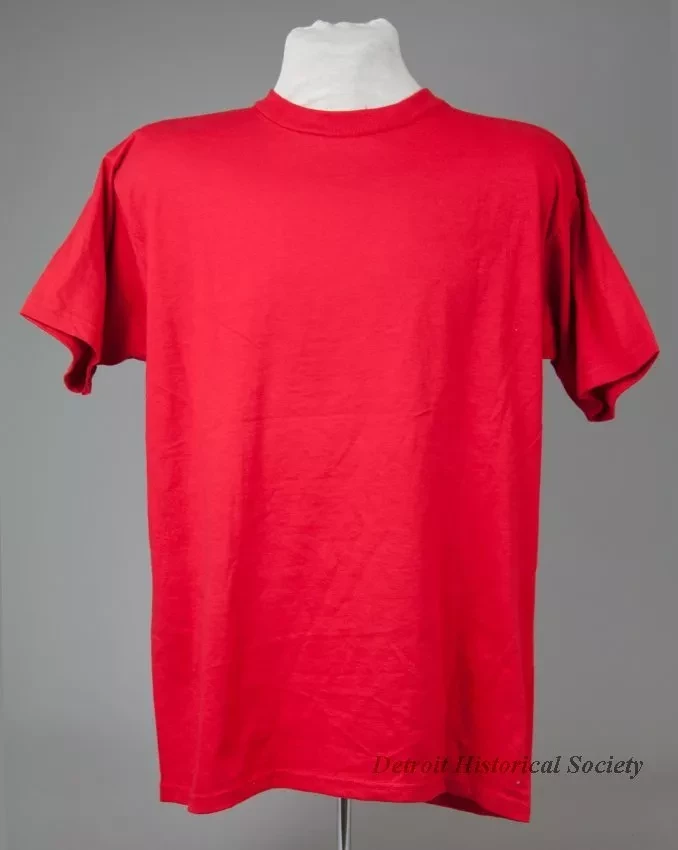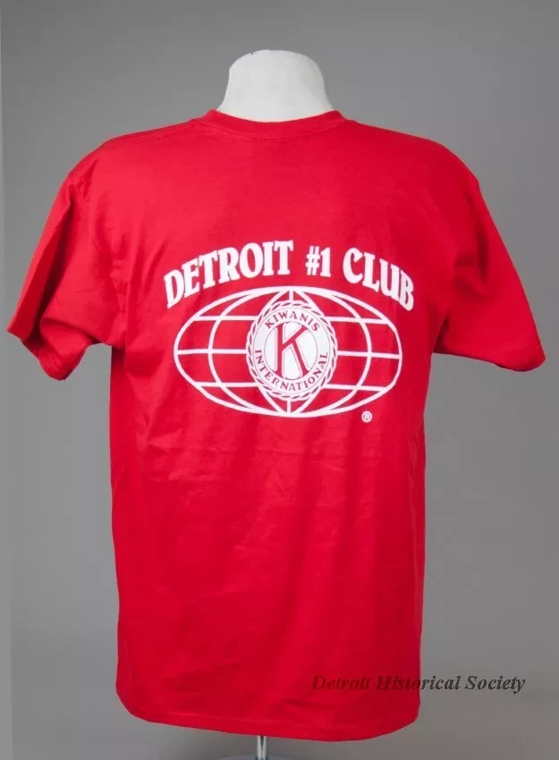 One Kiwanis "Detroit #1 Club" T-Shirt. The short sleeve T-shirt is made of a red cotton/polyester fabric. The back is stamped with white text that reads "Detroit Club #1" and a white "Kiwanis International" logo. The inside back collar has a "Fruit of the Loom" manufacturer's label as well as a label that shows size "L," fabric content of "50% cotton/50% polyester," and washing instructions.