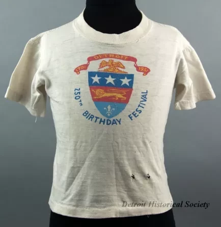 One child's T-shirt from the "Detroit 250th Birthday Festival." The shirt is made of white cotton fabric and is stamped on the front with yellow and blue text along with the multicolor festival logo.