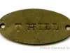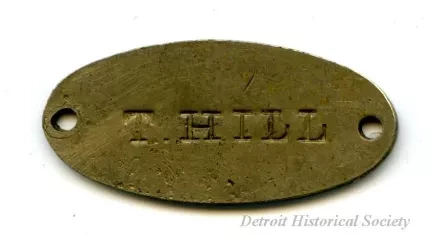 One metal tag. The oval-shaped tag is made of nickel-plated brass that is stamped with the name, "T. Hill" on one side and is blank on the other side. This tag was contained in the lead box time capsule that was removed from the Old City Hall on May 25, 1961.