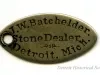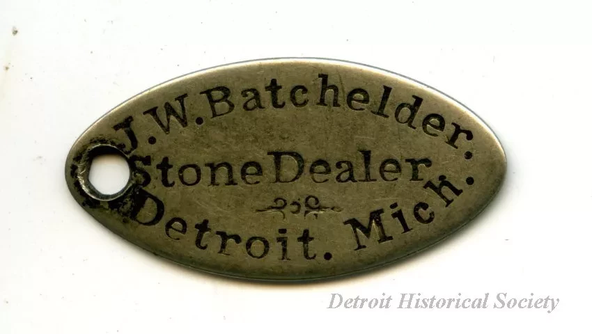 One metal tag. The oval-shaped tag is made of nickel-plated brass that is stamped with the name, "J. W. Batchelder, Stone Dealer, Detroit, Mich." on one side and is stamped "S. O. Smith, Manuf'r, Newark, N.J." on the other side. This tag was contained in the lead box time capsule that was removed from the Old City Hall on May 25, 1961.