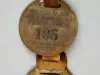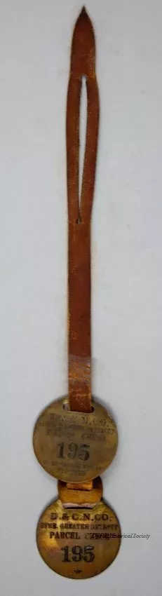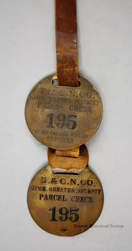 One luggage tag and corresponding claim tag from the passenger steamship, SS GREATER DETROIT, of the Detroit & Cleveland Navigation Company (D&C Line). The tag assembly consists of a pair of numbered circular brass tags with one tag attached to a leather strap and the other being removable. The strap has a slit near one which allows it to be looped around the handle on a piece of checked luggage. The removable tag would be given to the customer as a claim tag. Both tags are stamped with black text that reads "D. & C. N. Co., Stmr. Greater Detroit, Parcel Check, 195," but the claim tag has additional text that reads "To Be Called For On Steamer." No manufacturer's name or marks are shown.