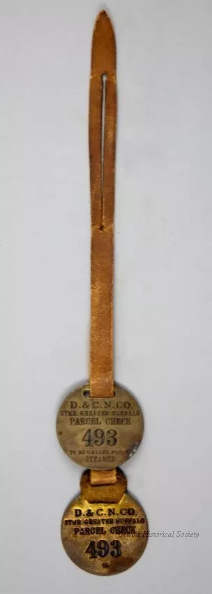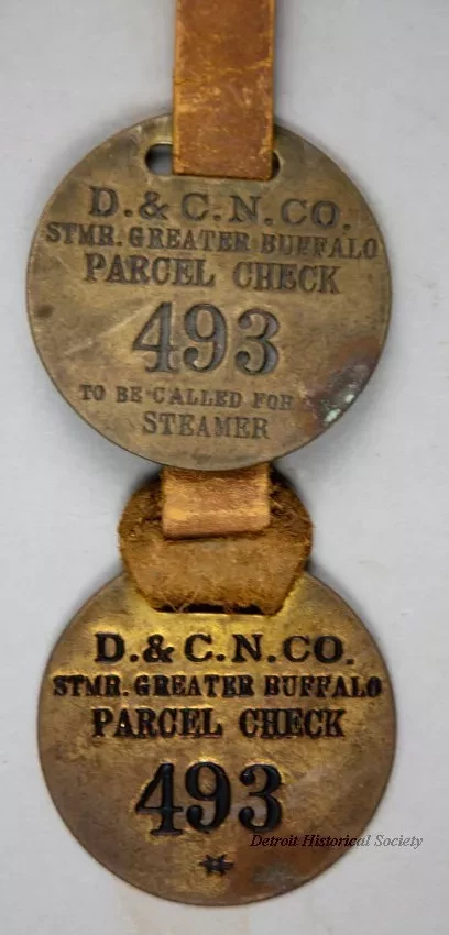 One luggage tag and corresponding claim tag from the passenger steamship, SS GREATER DETROIT, of the Detroit & Cleveland Navigation Company (D&C Line). The tag assembly consists of a pair of numbered circular brass tags with one tag attached to a leather strap and the other being removable. The strap has a slit near one which allows it to be looped around the handle on a piece of checked luggage. The removable tag would be given to the customer as a claim tag. Both tags are stamped with black text that reads "D. & C. N. Co., Stmr. Greater Detroit, Parcel Check, 493," but the claim tag has additional text that reads "To Be Called For On Steamer." No manufacturer's name or marks are shown.