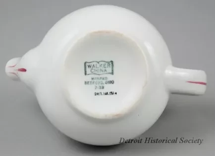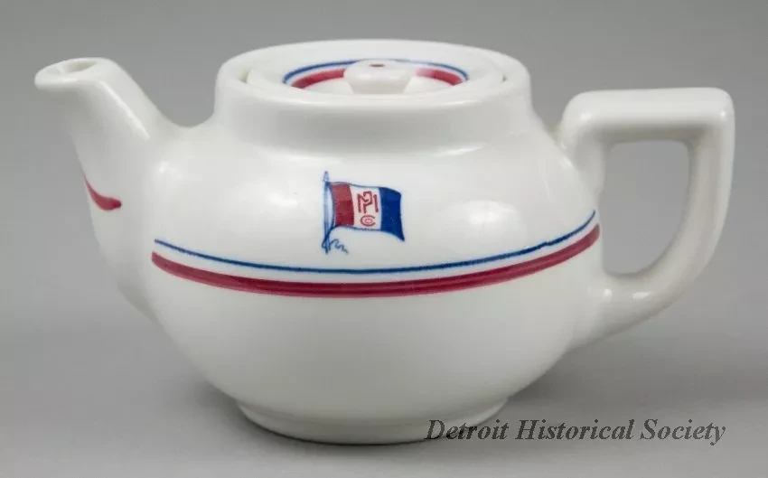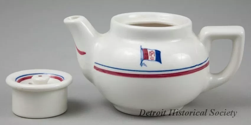 One small teapot from a dining room of the Pickands Mather & Company steamship fleet. The pot is made of heavyweight white glazed china. It has a small top with a curved spout, a circular removable depressed lid, and a small curved handle with a flat thumb rest. The lid has a knob at the center, and narrow red and blue stripes encircle the top surface along the midpoint. Matching red and blue stripes encircle the pot just above the midpoint. A red/white/blue image of the "PM Co." company flag is stamped on both sides of the pot above the stripes. The underside is stamped with black text that reads "Walker China, Vitrified," and "Bedford, Ohio, 7-33."