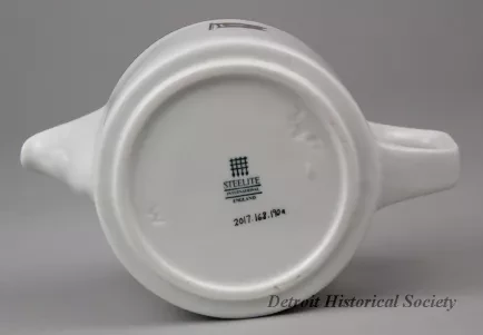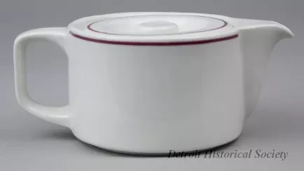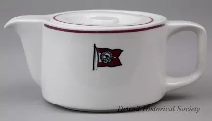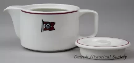 One small teapot from a dining room of the Algoma Central Railway steamship fleet. The cylindrically-shaped pot is made of heavyweight white glazed china. It has a wide top with a tall curved spout, a circular removable depressed lid, and a rectangular handle with a flat thumb rest. The lid has a knob at the center, and a narrow red stripe encircles the top surface along the outer edge. A matching red stripe encircles the pot at the outside top edge except at the spout and handle. A red/white/blue image of the "Algoma Central Marine" company flag is stamped on one side of the pot below the stripe. The underside is stamped with a small portcullis grate logo and black text that reads "Steelite International, England."