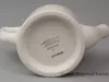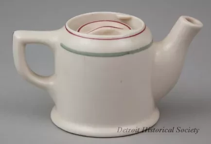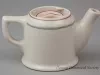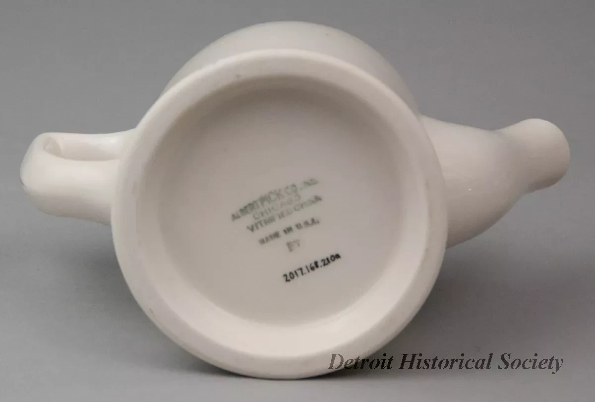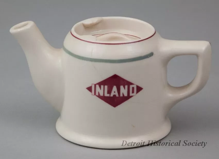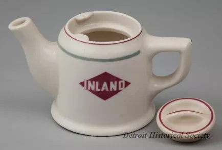One small teapot from the dining room of the bulk carrier, SS Philip D. Block, of the Inland Steel Company fleet. The pot is made of heavyweight glazed china of a bone/ivory color. It has a curved spout, a wide depressed top with a removable circular lid, and a small curved handle with a flat thumb rest. The sides are fairly straight with an inward curve at the top and a slight outward flare at the base. The circular lid has a narrow lift handle at the center with a red stripe on top and a red stripe along the outer edge. A narrow red stripe encircles the outside top edge of the teapot rim and a narrow gray stripe is located about 3/8" beneath it. A red diamond-shaped company emblem, which shows the name, "Inland," in bone/ivory-colored text, is stamped below the stripes on one side of the teapot. The underside is stamped with black text that reads "Albert Pick Co., Inc., Chicago," and "Made in U.S.A., E7."