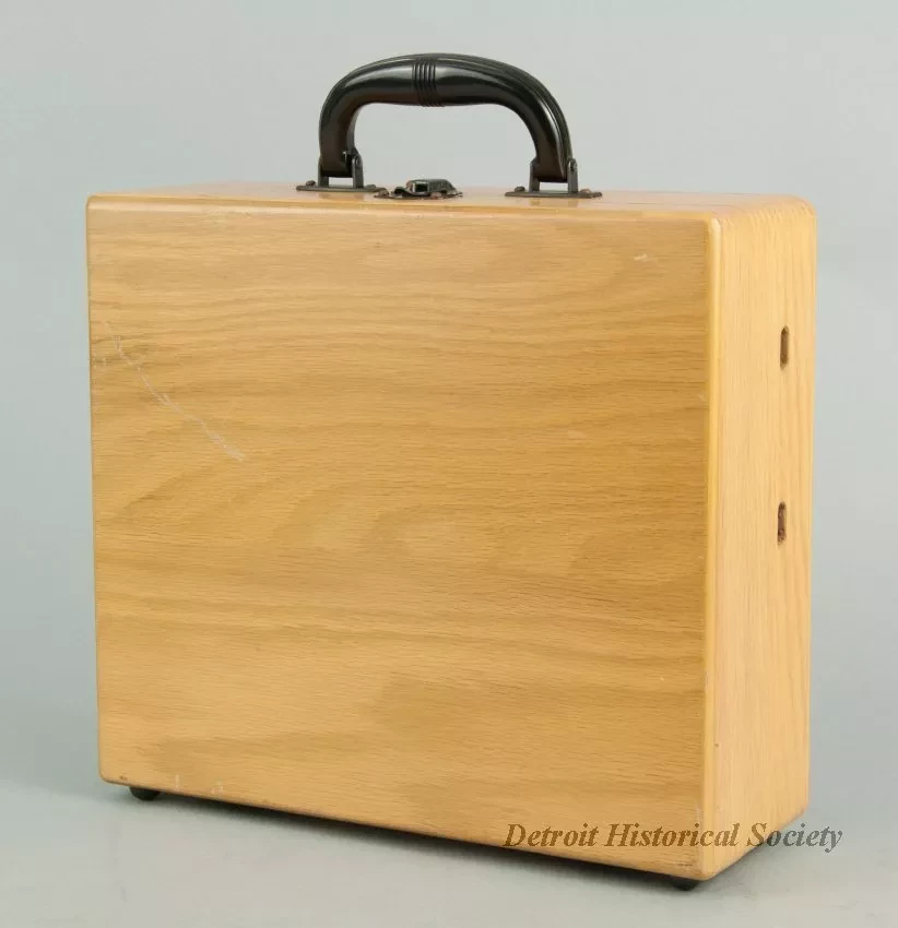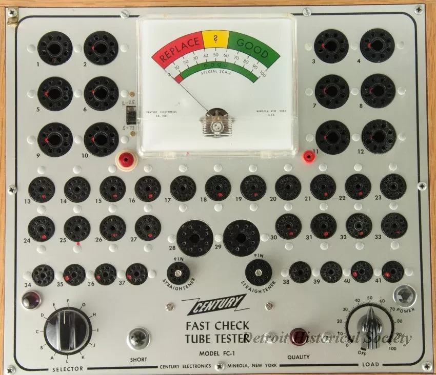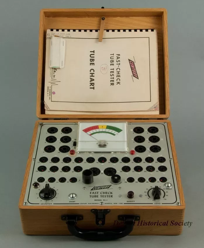 One Century Fast Check Tube Tester, Model FC-1. Portable tester for TV and Radio tubes with 41 tube sockets, meter, 3 status lights, and pin straighteners on panel. Set in an oak case with plastic carrying handle. Top comes off and has storage for a plastic comb-bound booklet with instructions and tube chart. Booklet is heavily annotated by the original user and dated 1958, with updates from 1959, 1960, and 1961, and an original advertising page for this model that targets professional television repairmen.