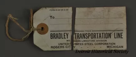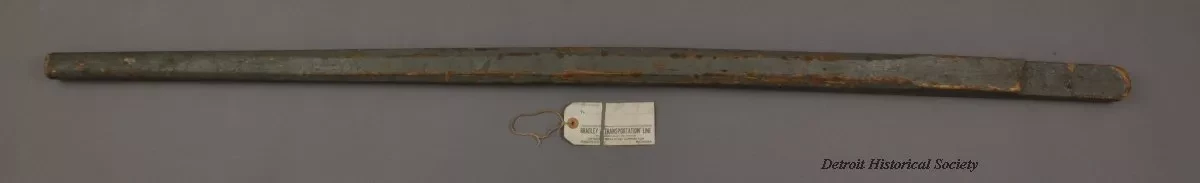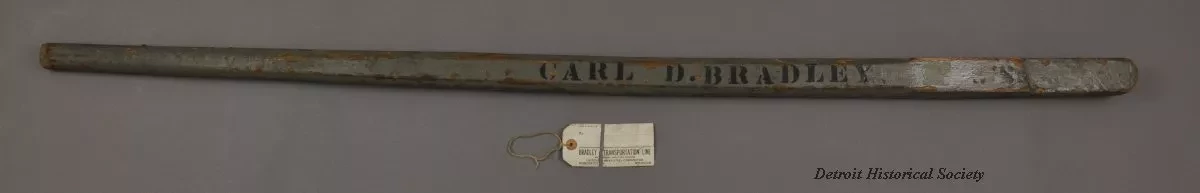 Tiller from the lifeboat of the steamer CARL D. BRADLEY with a Bradley Transportation Line tag. Wood painted gray with ship's name stenciled in black. The BRADLEY sank in northern Lake Michigan on November 18, 1958. Two crewmen were rescued by CG Cutter SUNDEW, but thirty three men perished.