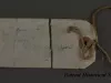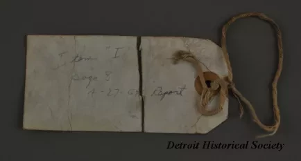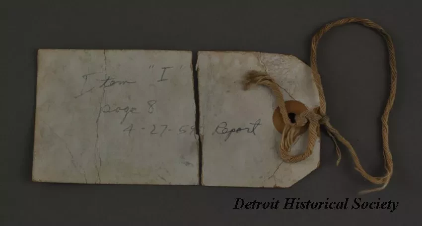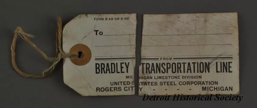 White tag from Bradley Transportation Line is attached to tiller. Handwritten on back is "Item 'I' page 8, 4-27-59 Report," possibly related to an investigation after the sinking. Front of tag is printed "Bradley Transportation Line, Michigan Limestone Division, United States Steel Corporation, Rogers City, Michigan."