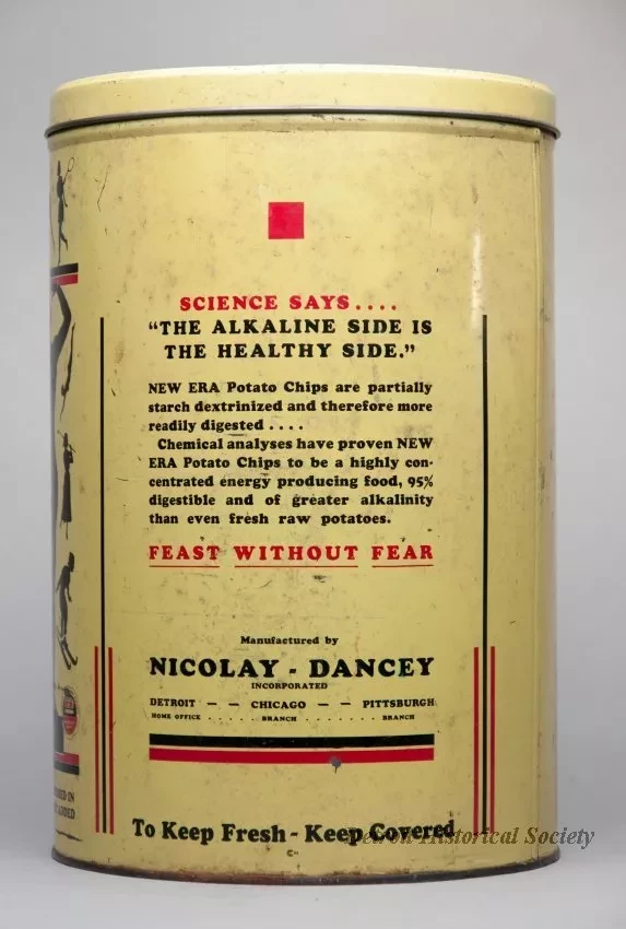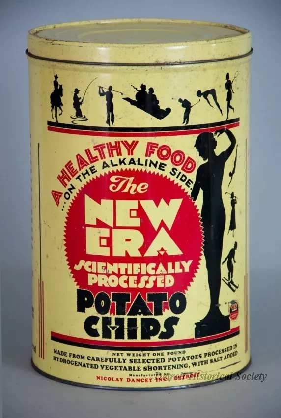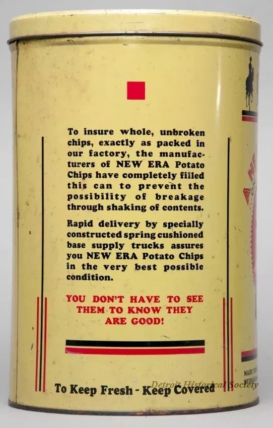 A cylindrical tin for "The New Era Scientifically Processed Potato Chips" manufactured by Nicolay Dancey, Detroit, Michigan. It was designed to hold one pound of potato chips. The tin is painted pale yellow and has black and red lettering. There are some small rust spots where the tin plating has worn away from the underlying steel.