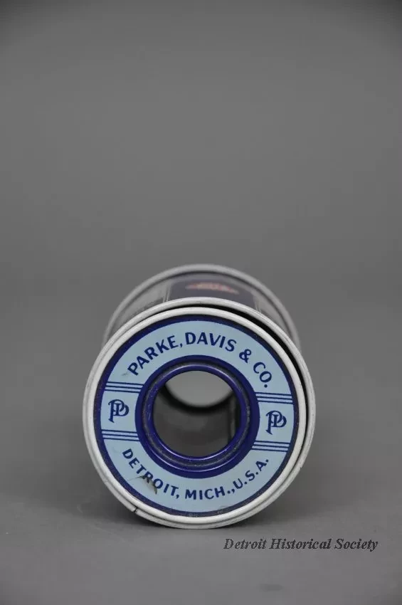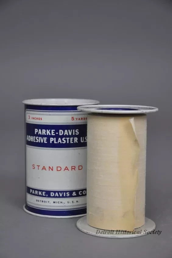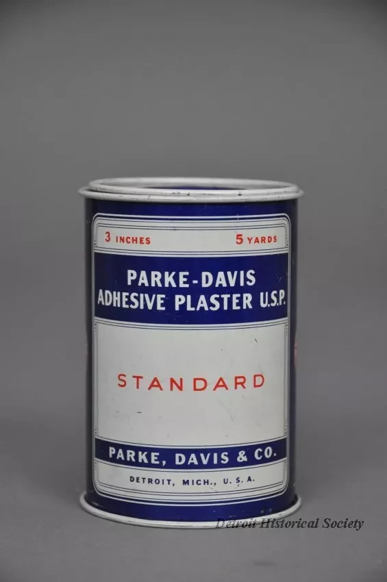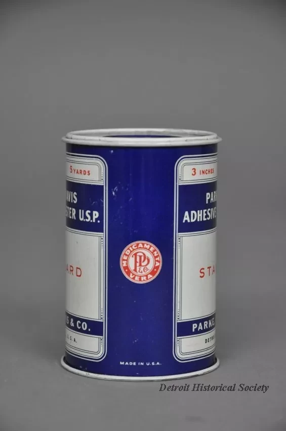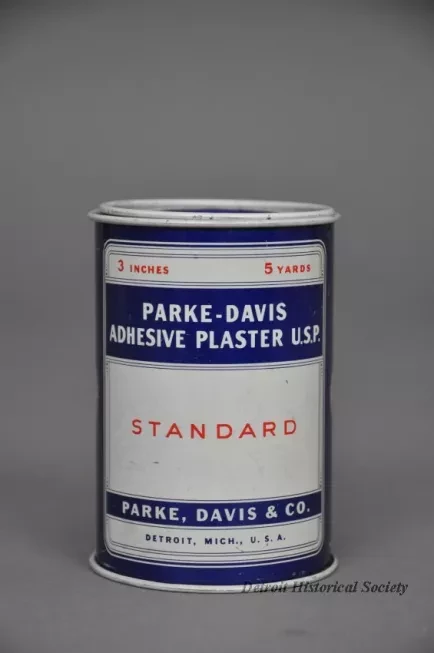 One metal tin containing a "Parke-Davis Adhesive Plaster, U.S.P." The tin has a cylindrical shape and has a removable metal spool on the inside. The spool contains a roll of 3-inch wide, 5-yard long cloth bandage material. The tin is made of light steel that has been painted red, white, and blue. Text on the spool ends and on the side of the tin shows "Parke, Davis & Co., Detroit, Mich., U.S.A."