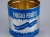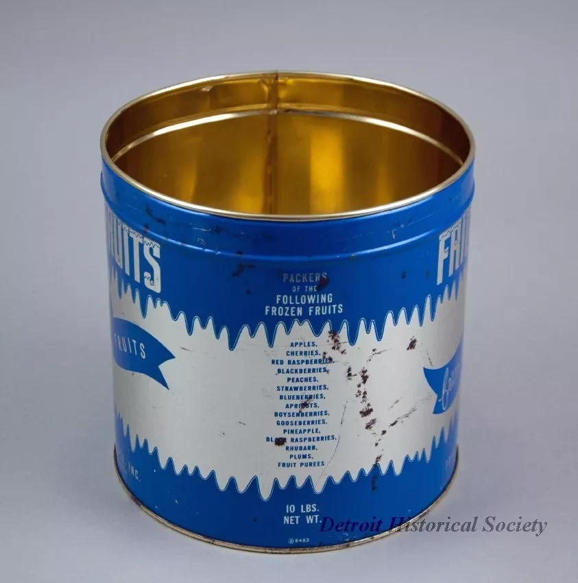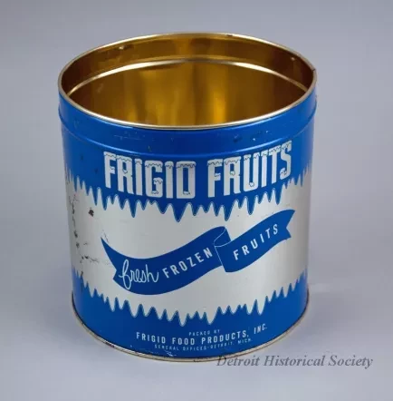 One empty tin of "Frigid Fruits" from Frigid Food Products, Inc., of Detroit. The large cylindrical tin is made of thin sheet steel that has a gold-colored plating on the interior and underside and silver-colored plating on the exterior sides. The interior bottom has a 1-inch tall plastic liner. The exterior sides are printed with irregular blue bands along the top and bottom that resemble frozen layers of ice. Text on the side reads "Frigid Fruits, Fresh Frozen Fruits" as well as "Packers of the Following Frozen Fruits: Apples, Cherries, Blackberries, Peaches, Strawberries, Blueberries,Apricots, Boysenberries, Pineapples, Raspberries, Rhubarb, Plums, Fruit Purees," and "10 Lbs. Net Wt."
