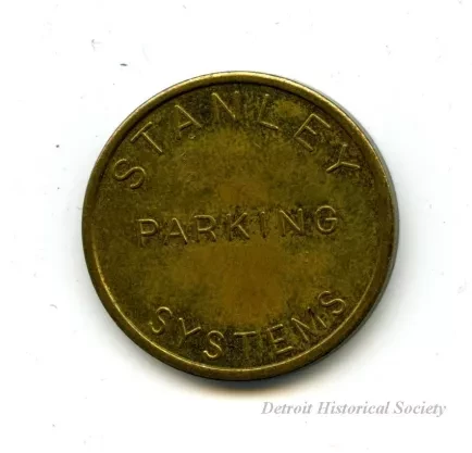 One gold-colored token (probably copper plate on aluminum) for use in a downtown Detroit parking facility. The token is stamped "Stanley Parking Systems" on the obverse and is stamped "719 Token" on the reverse.