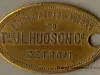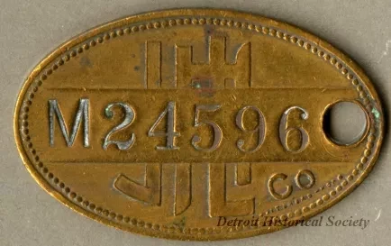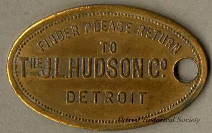 Brass J.L. Hudson Company charge coin, numbered M24596, used to make purchases on credit at the downtown department store. The tag is elliptical in shape with a hole in one end, and is embossed with the customer's number on the recto over the stylized "JLH Co." logo. "Finder Please Return to The J.L. Hudson Co., Detroit" is embossed on the verso.