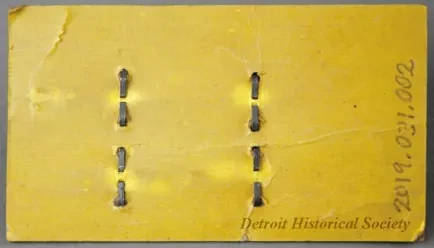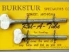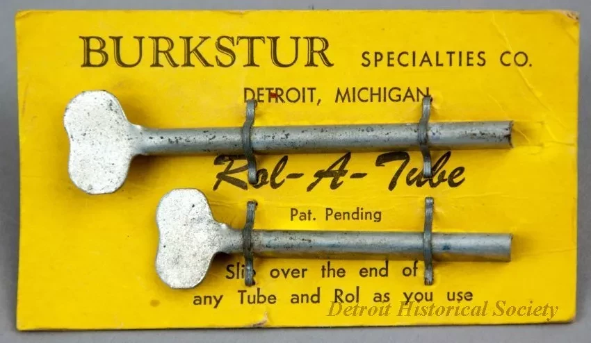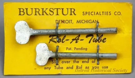 One pair of tube-rolling tools. The "Rol-A-Tube" tools were made to fit onto the ends of metal packaging tubes (such as toothpaste) and make it easy for the user to roll up the tube from the bottom end and thereby squeeze all of the contents out of the tube. Each tool has a slotted arm with a thumb tab at one end. They are made of stamped steel with a galvanized finish and are mounted on a yellow heavyweight paper card for retail sale. The card is printed with black text that reads "Burkstur Specialties Co., Detroit, Michigan," and "Rol-A-Tube. Slip over the end of any tube and roll as you use."