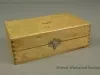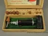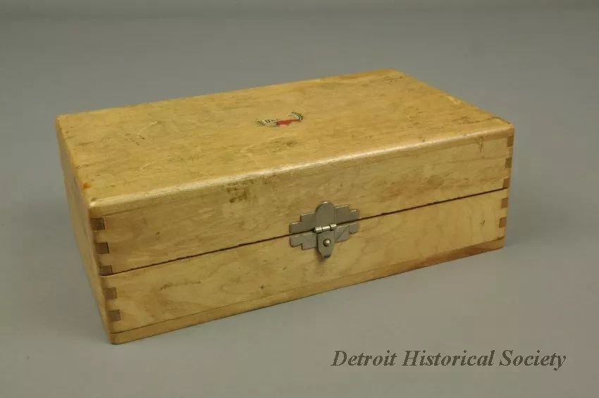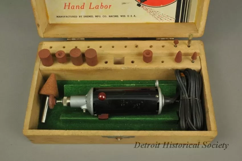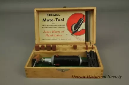 One Dremel Moto-Tool Model No. 1. The handheld power tool is cylindrical in shape and has a black plastic body with a red plastic power switch and cast aluminum ends. The working end has a small chuck for various cutting and grinding bits. The other end has a power cord and a small metal loop. Stamped text on the plastic body shows "Model 1 Moto-Tool, Mfd. by Dremel Mfg. Co., Racine, Wis., U.S.A. Pat. No. 2,119,986. 65 Watts, 110 Volt A.C. or D.C." The tool and accessories are contained in a white pine storage box that has dovetailed corners and a hinged top with latch. The box interior has a felt-lined bottom for tool storage and two wood strips with bored holes for bit storage. Eleven bits are included in the box. The inside top panel has a printed sheet that shows a brief description of the tool.