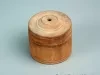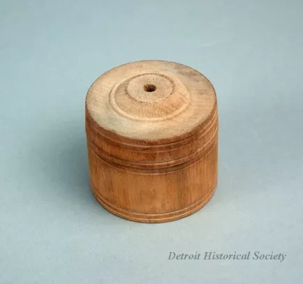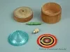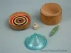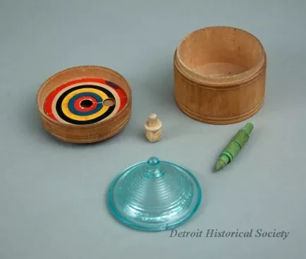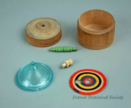 A toy top made of glass with a wooden storage box. The glass top is made of pale blue glass and is marked "Made in U. S. A., Pat. May 8, 1894." The short, cylindrically-shaped box is made of fine-grained wood and has a removable, friction-fit lid. A circular piece of paper with a multi-colored "bullseye" design fits inside the box lid. A wooden spindle, painted green, fits upright in the center of the lid. A small white knob is also included. The number, "5," is pasted on the side of the wooden box.