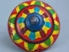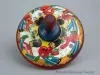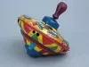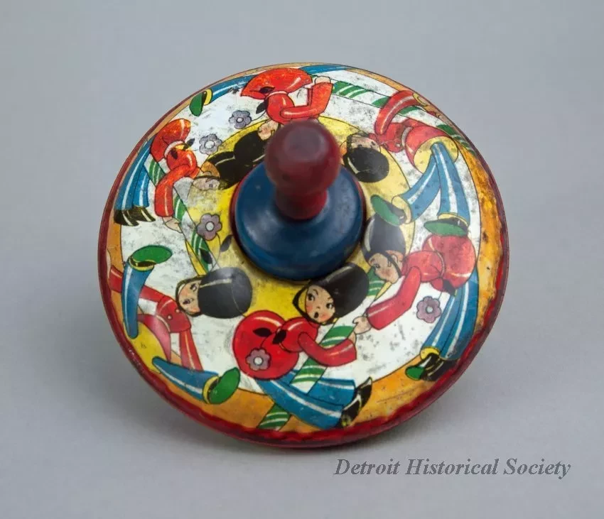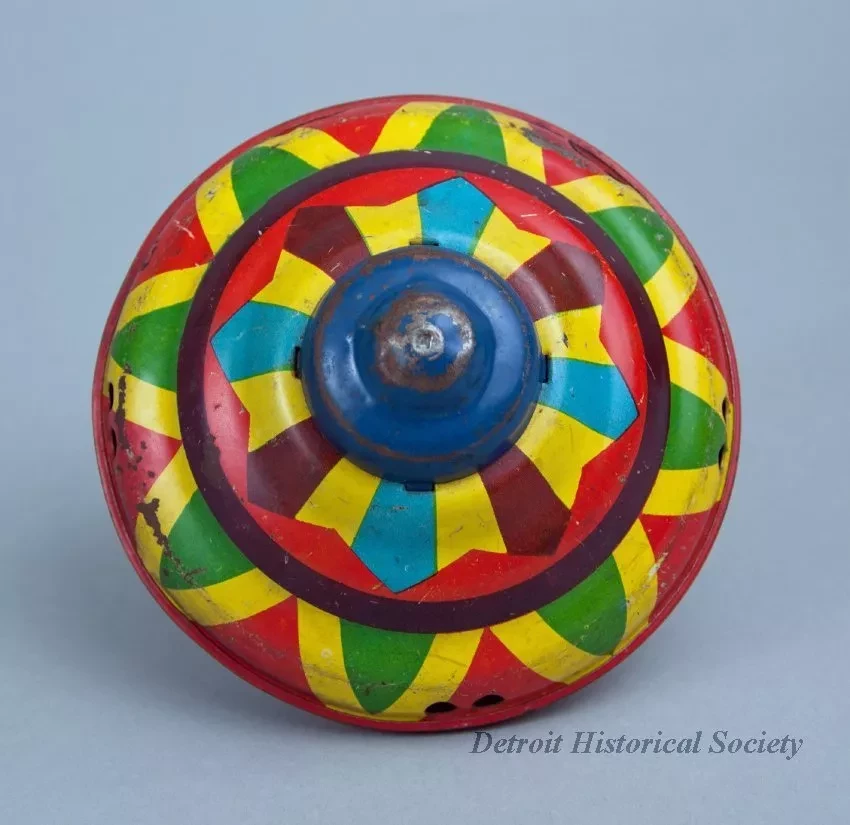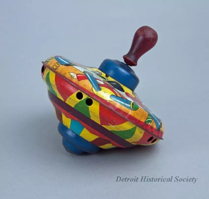 Toy top made of tin. Painted in multi-color design with toy soldiers on top, a geometric pattern on lower surface, and a blue tip. Has a red knob at top end of spiral shaft that is pushed down to make top spin. Five pairs of holes around sides produce a humming sound when top is spinning. Marked on side: "Ohio Art 53 Made in USA."