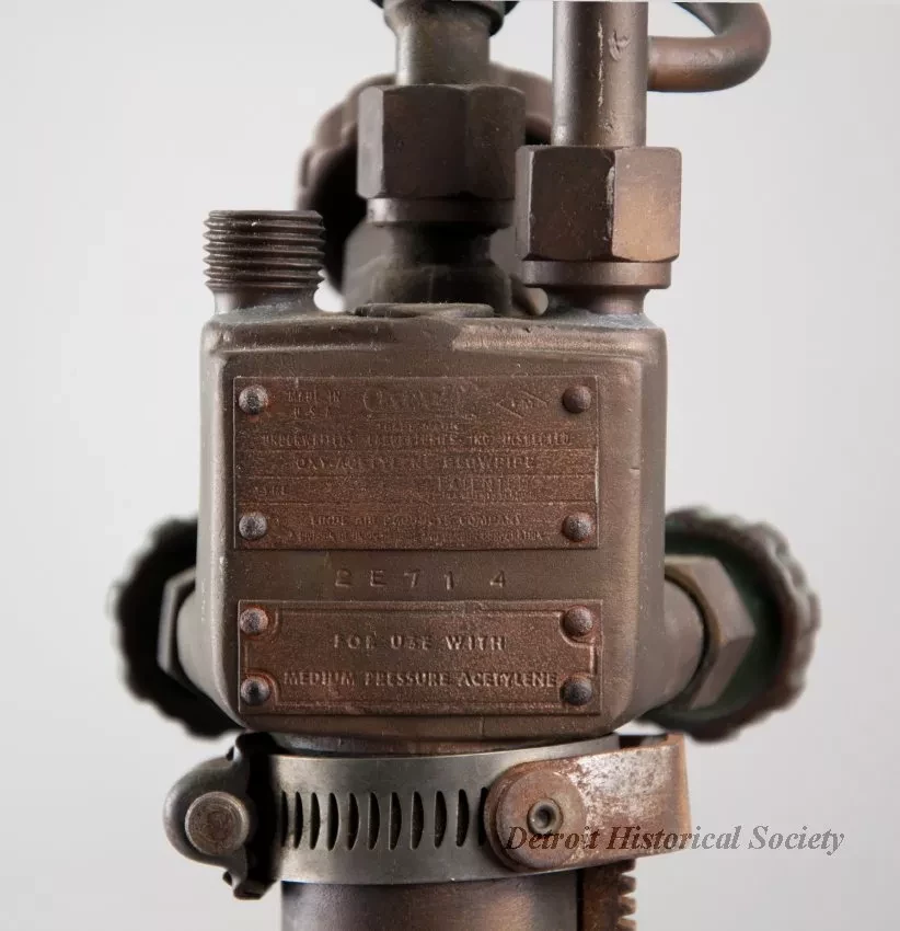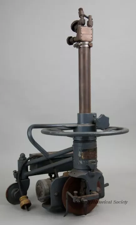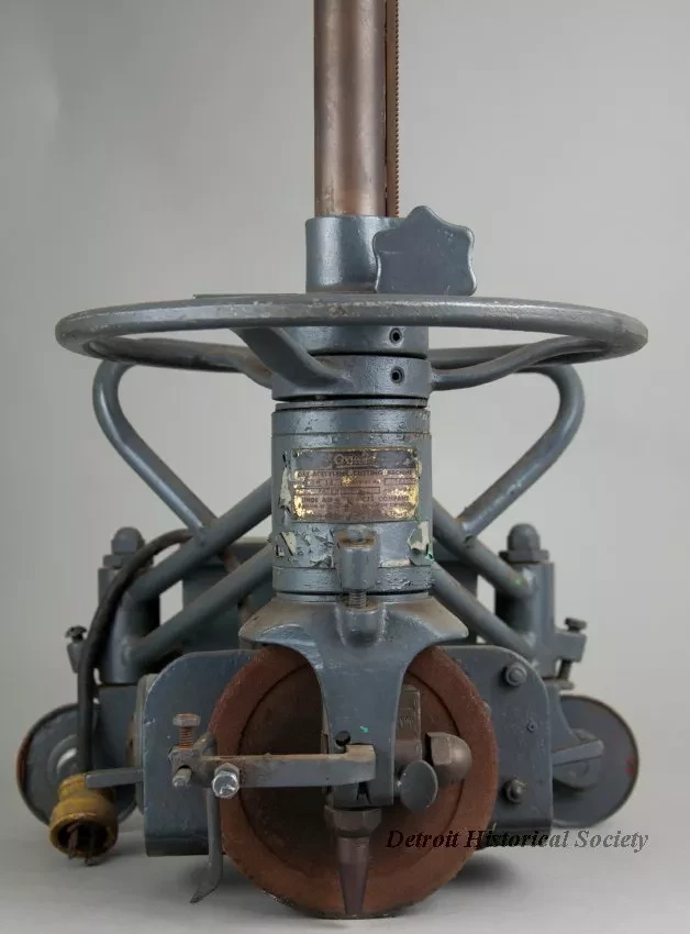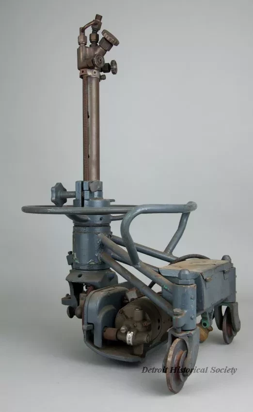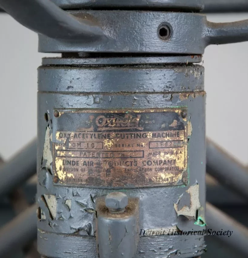 One "CM-16 Oxy-Acetylene Portable Cutting Machine" made by the Linde Company. It has a sturdy steel framework with small wheels, a steering wheel, an electric motor with a short power cord and plug, a small storage box with a hinged top, and an adjustable cutting torch. The steel framework is painted gray. The tool was designed for straight-line cutting, circle cutting, hand-guided cutting, and bevel cutting of steel up to 4 inches in thickness. A 31-page instructions manual is also included.