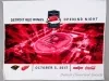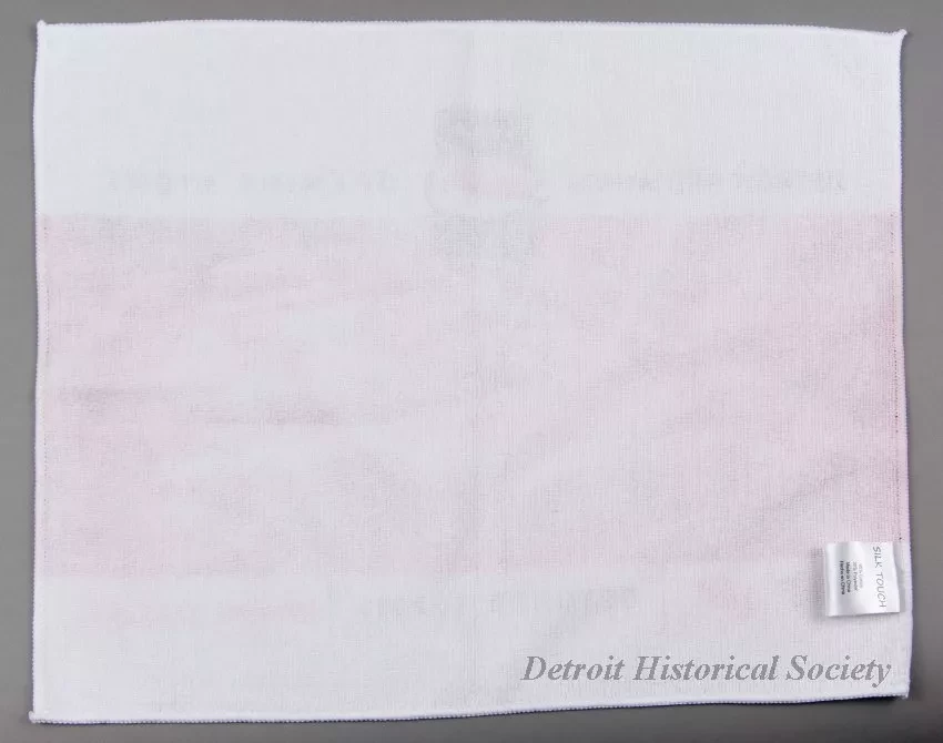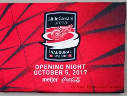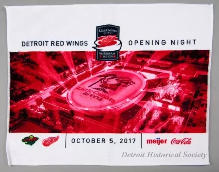 One white terry cloth towel. The commemorative towel is printed with small text that reads "Little Caesars Arena Inaugural Season" and larger black text that reads "Detroit Red Wings Opening Night, October 5, 2017." At the center of the towel, a large red/black photographic image shows an aerial view of the new arena the Little Caesars mascot on the roof. Minnesota Wild, Red Wings, Meijer, and Coca-Cola logos are shown along the bottom of the towel. A tag sewn into the hem on the back of the towel reads "Silk Touch, 65% Cotton, 35% Polyester, Made in China" and also shows washing instructions.