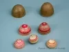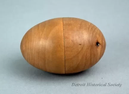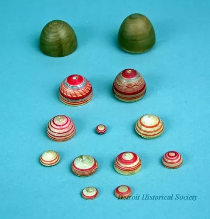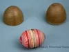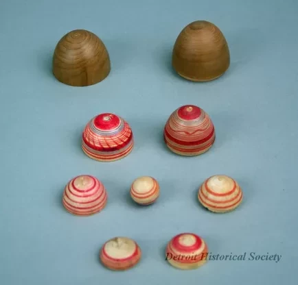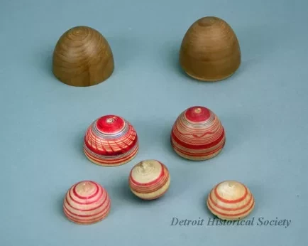 Set of seven wooden nesting eggs. Outermost egg is smooth and finished with a clear lacquer or oil. Inner eggs are painted in different patterns with red, white, and/or purple stripes.